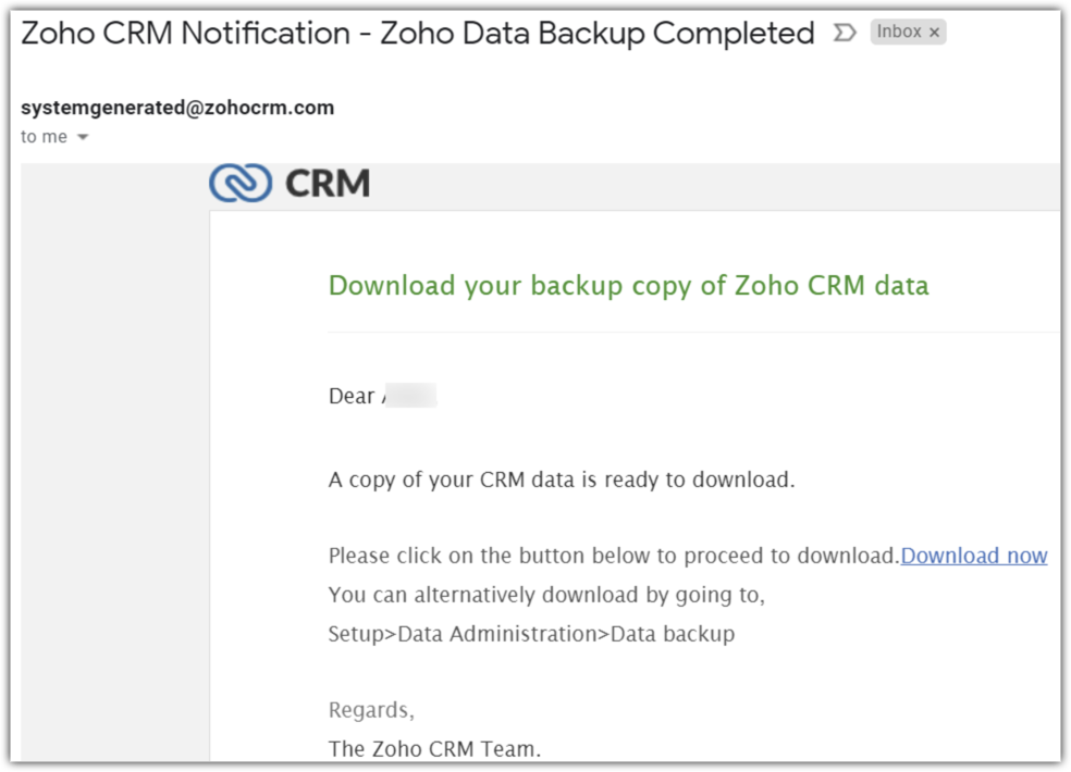 Emailul va fi trimis de la systemgenerated@zohocrm.com și subiectul emailului va fi „Zoho CRM Notification - Zoho Data Backup Completed".