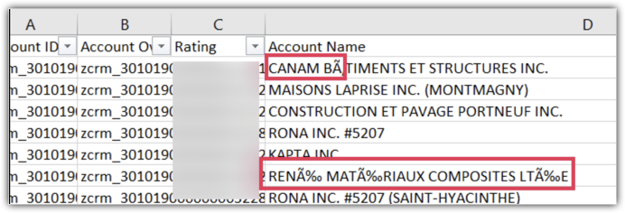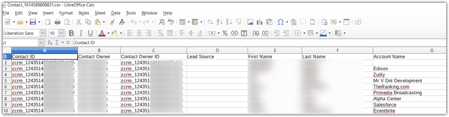 Dacă datele apar distorsionate în fișier, îți recomandăm să deschizi fișierul în format CSV și să verifici dacă problema persistă. Dacă da, verifică în contul tău CRM că valoarea câmpului sau numele înregistrării este corect. Dacă totul pare în regulă în CRM, trimite-ne un email la support@zohocrm.com cu descrierea problemei și o captură de ecran a fișierului care arată unde datele sunt distorsionate sau lipsesc, precum și ID-urile înregistrărilor respective, astfel încât să putem verifica din backend.