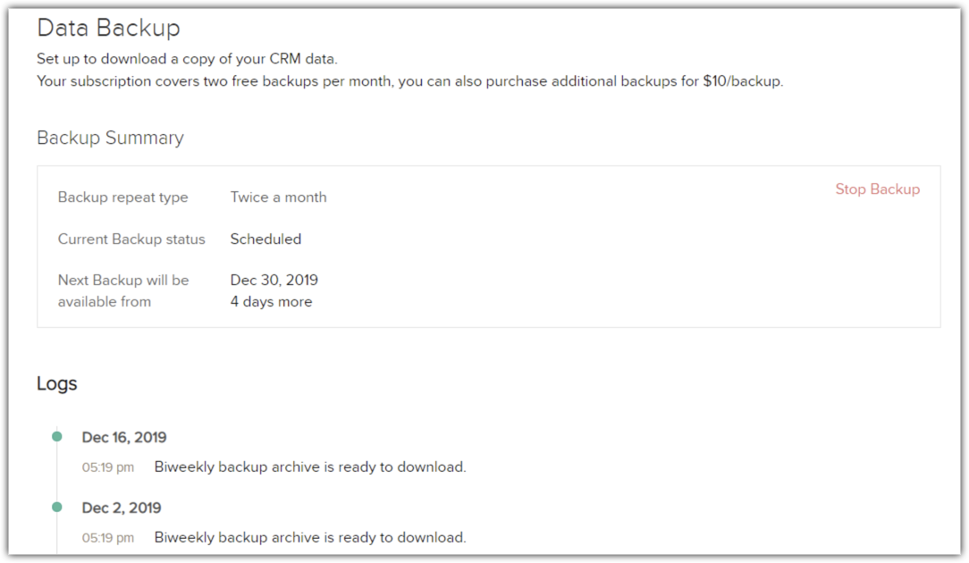 Link-ul de descărcare a backup-ului este disponibil doar 7 zile de la data backup-ului. În captura de ecran de mai sus, backup-ul de date era pregătit pentru descărcare pe 16 decembrie, deci link-ul ar fi fost activ până pe 22 decembrie. Vei primi o notificare prin email de la Zoho CRM când backup-ul de date este finalizat și pregătit pentru descărcare, astfel încât să nu îl ratezi.