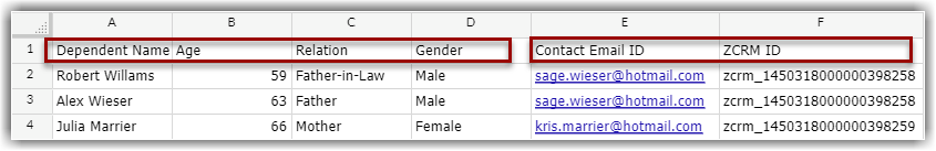Asigură-te că primul rând de date (înregistrări) din fișierul sursă conține antetele de coloană sau numele câmpurilor, nu valorile efective ale datelor. Aceste valori ale numelor de câmpuri din antet ajută la identificarea datelor atunci când mapezi noile date cu câmpurile existente din Zoho CRM.