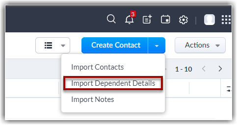 În pagina principală a modulului, fă clic pe Import Subforms din meniul derulant Create Contact .