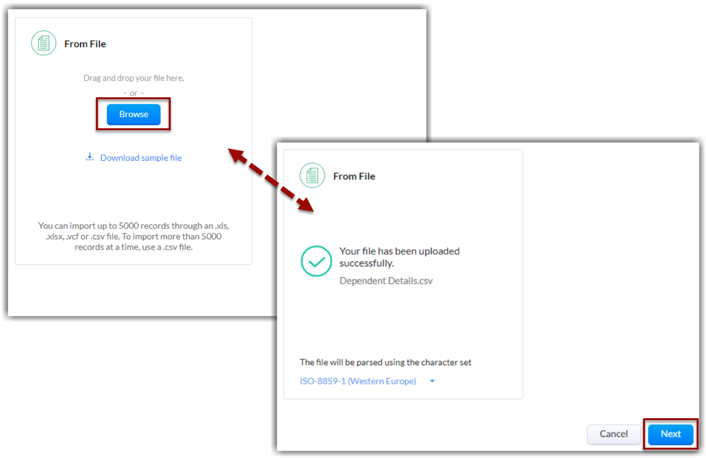 Dacă fișierul de import este în format .XLS, .XLSX sau .VCF, poți importa maximum 5000 de înregistrări/lot pentru toate edițiile CRM. Cu toate acestea, pentru a importa mai mult de 5000 de înregistrări/lot, fișierul de import trebuie să fie doar în format .CSV, iar numărul maxim de înregistrări pe care le poți importa va varia în funcție de abonamentul tău.