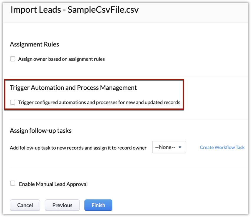 Notă: Fluxurile de lucru bazate pe dată vor fi declanșate chiar dacă opțiunea "Trigger configured automation..." este debifată, deoarece funcționează pe baza datelor. De exemplu, un flux de lucru setat la "created date" se va activa în timpul importului.