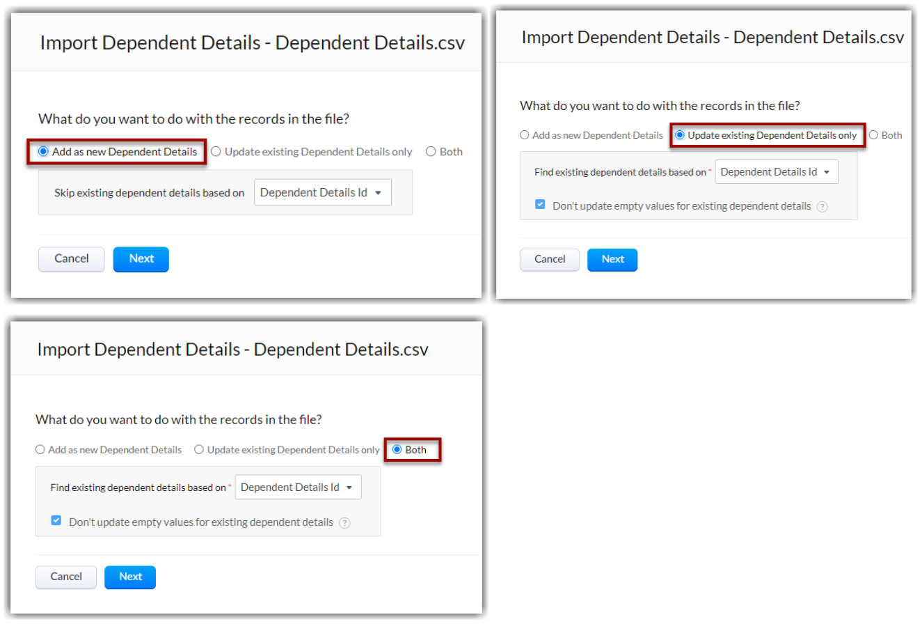 - Both: Alege această opțiune pentru a actualiza modificările în înregistrările existente și pentru a adăuga înregistrări noi dacă există. Această opțiune filtrează înregistrările existente care trebuie actualizate. De asemenea, poți alege să sari peste actualizarea valorilor goale din fișierul de import.