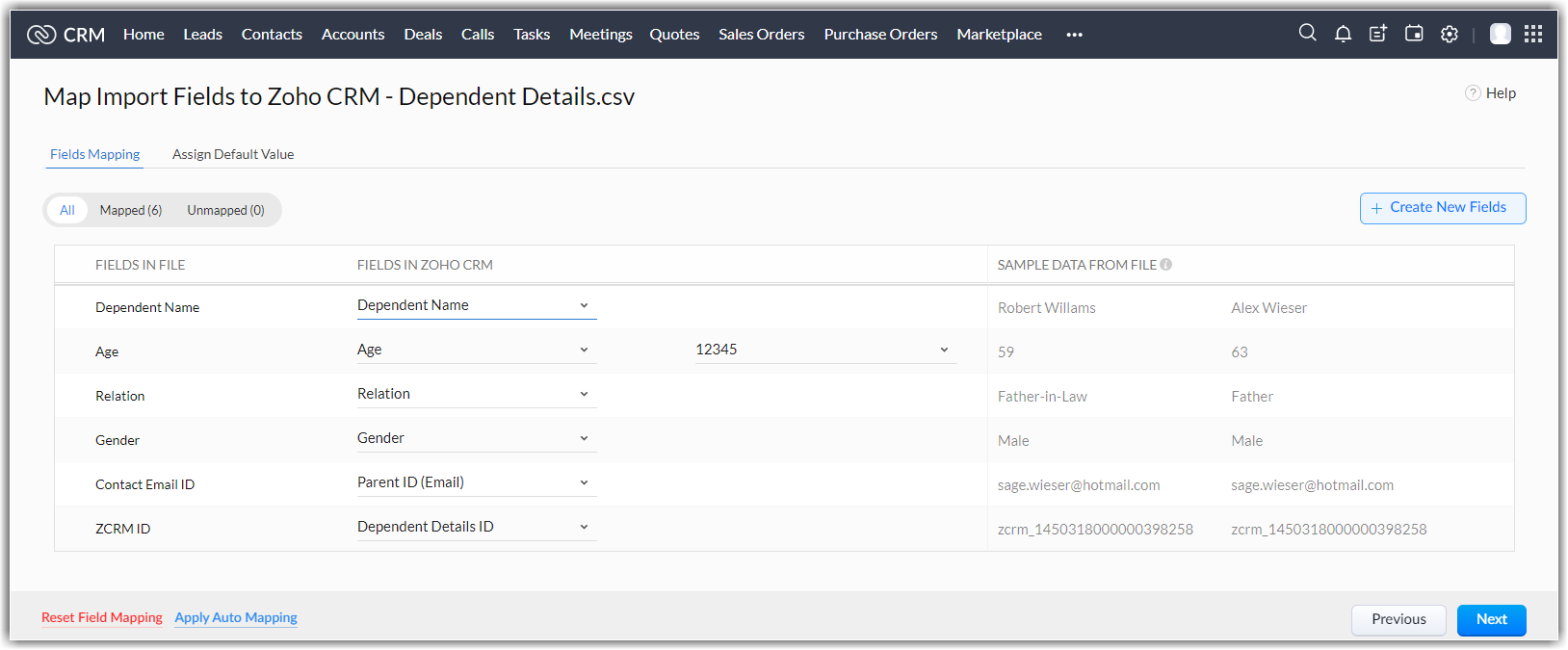 - Fă clic pe link-ul Apply Auto Mapping pentru a lăsa CRM să mapeze coloanele de import cu câmpurile corespunzătoare.