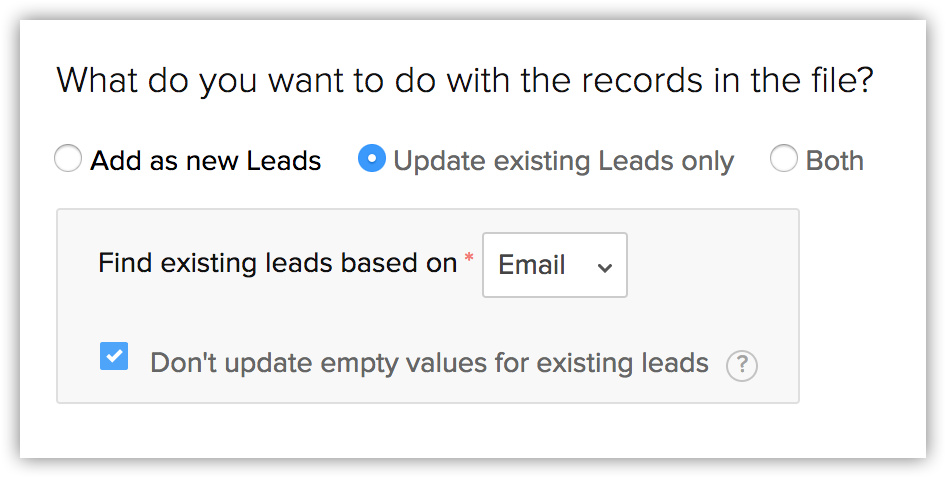 Selectează Record ID sau Email / Record Name din lista derulantă pentru a găsi înregistrările existente care se potrivesc cu cele din fișierul de import. Această opțiune te ajută să filtrezi înregistrările existente care trebuie actualizate. În plus, poți alege să sari peste actualizarea valorilor goale din înregistrări. De exemplu: Să presupunem că înregistrarea ta CRM are valoarea Hospitality pentru câmpul Industry și fișierul de import nu are nicio valoare pentru același câmp. Când importi datele din fișier și alegi Skip updating empty values, atunci valoarea goală nu va fi suprascrisă și valoarea câmpului Industry va rămâne neschimbată. Acest lucru va evita posibilitatea pierderii datelor.