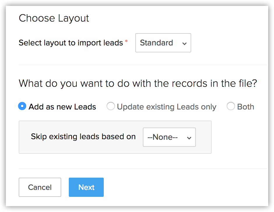 - Add as new [Records] : Alege această opțiune pentru a importa toate înregistrările din fișierul de import în Zoho CRM.
