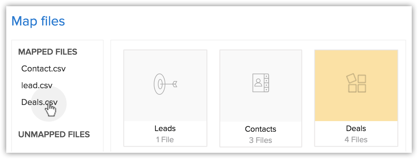 Zoho CRM citește automat fișierele și mapează datele la modulele și câmpurile corecte. - Poți face următoarele în secțiunea Module-File Mapping: