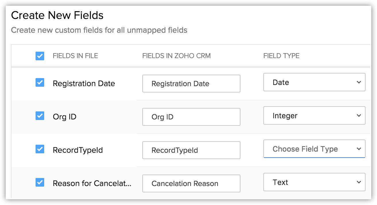 Câmpurile prezente în Zoho CRM vor fi disponibile în listele derulante. - Fă clic pe Create New Fields pentru a adăuga câmpuri noi și a insera date pentru acestea înainte sau în timpul migrării.