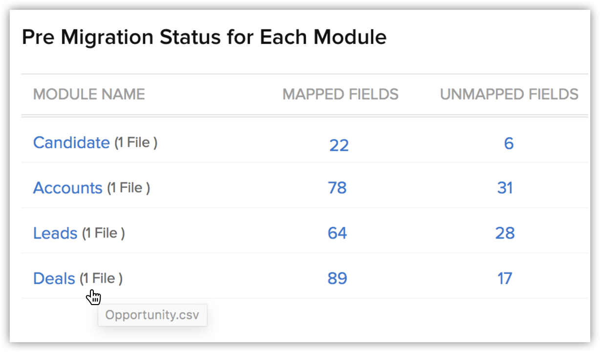 Poți migra următoarele module suportate în Zoho CRM din contul Salesforce:
