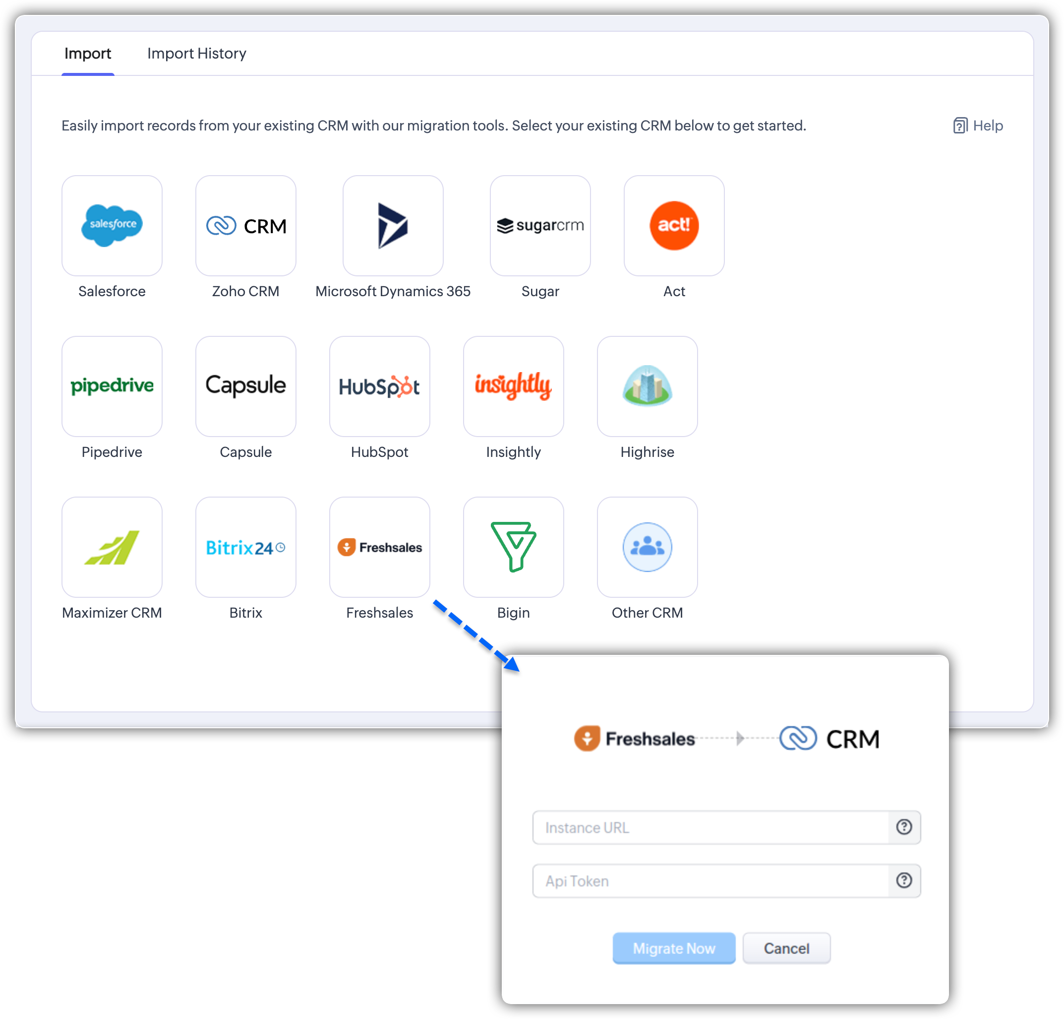 Poți migra datele din Freshsales în Zoho CRM folosind token-ul API și URL-ul instanței. Întreaga migrare rulează în fundal, iar odată finalizată, vei primi o confirmare prin e-mail. Poți anula sau rerula migrarea de până la trei ori, dacă este necesar.