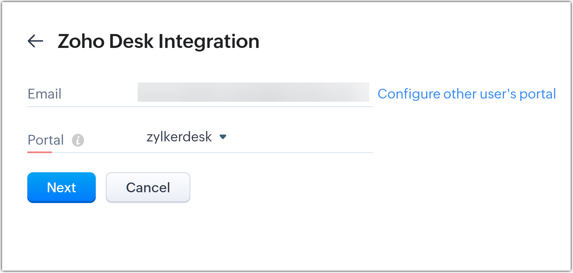 - Dacă nu ai un cont Zoho Desk asociat adresei tale de email, introdu numele Portal-ului și fă clic pe Next. Altfel, ignoră acest pas.