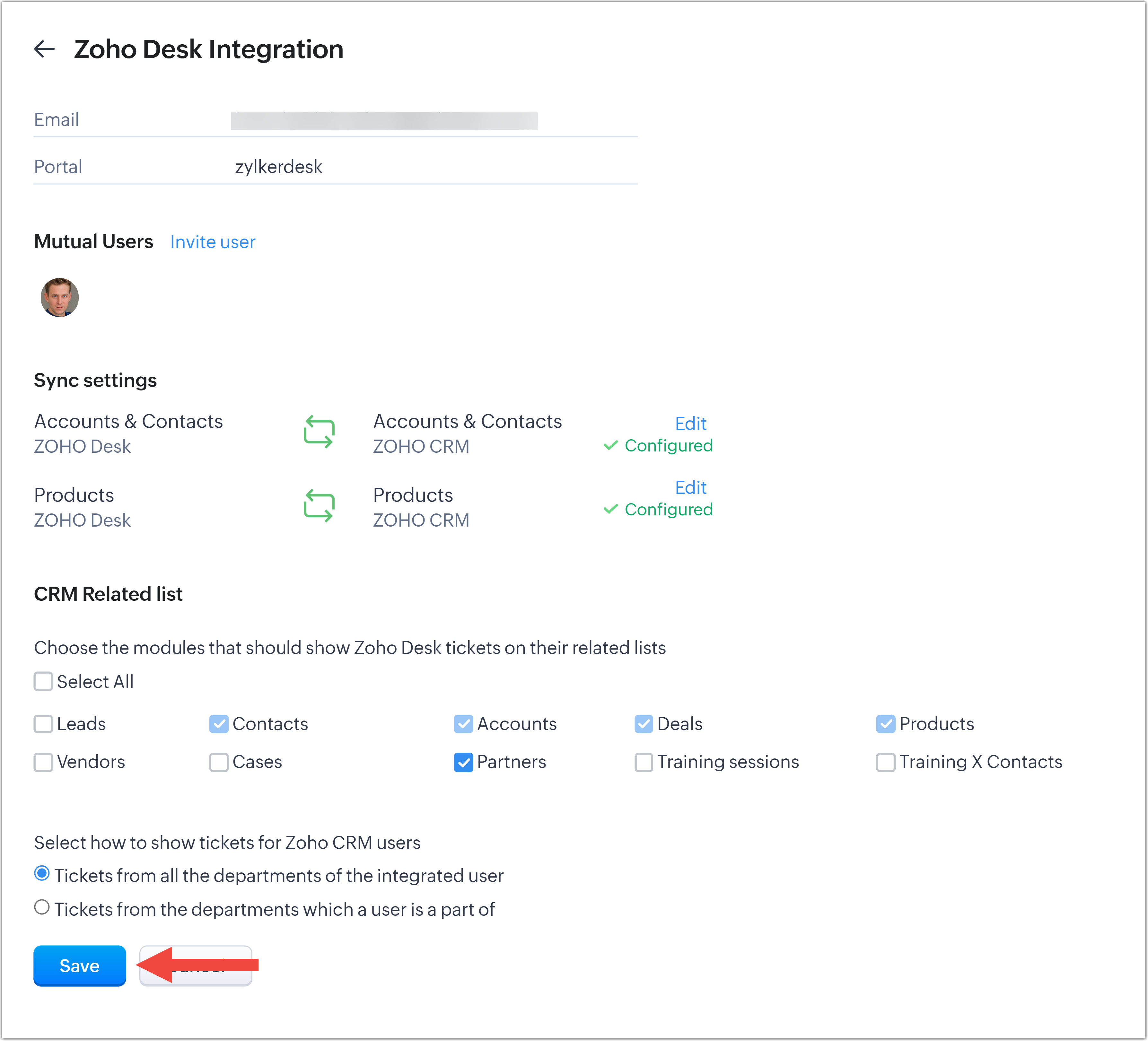 - Sub Select how to show tickets for Zoho CRM Users, setează vizibilitatea tichetelor pentru utilizatorii CRM. Pentru a afla mai multe, consultă Reglarea vizibilității tichetelor.