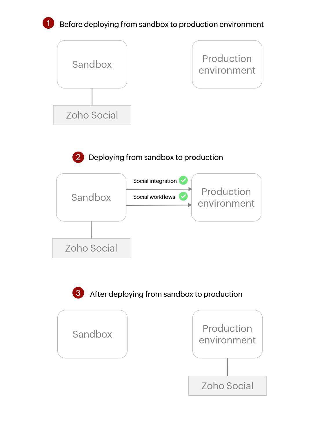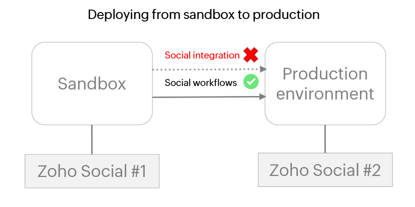 Va trebui să testezi temeinic integrarea în sandbox înainte de a o implementa în mediul de producție. Acest lucru se datorează faptului că un cont Zoho Social poate fi integrat cu un singur mediu CRM la un moment dat. Odată ce a fost implementată în mediul de producție, contul Zoho Social va fi eliminat din sandbox-ul tău. Nu se mai pot trimite alte modificări din sandbox către mediul de producție, în ceea ce privește acel cont Zoho Social.