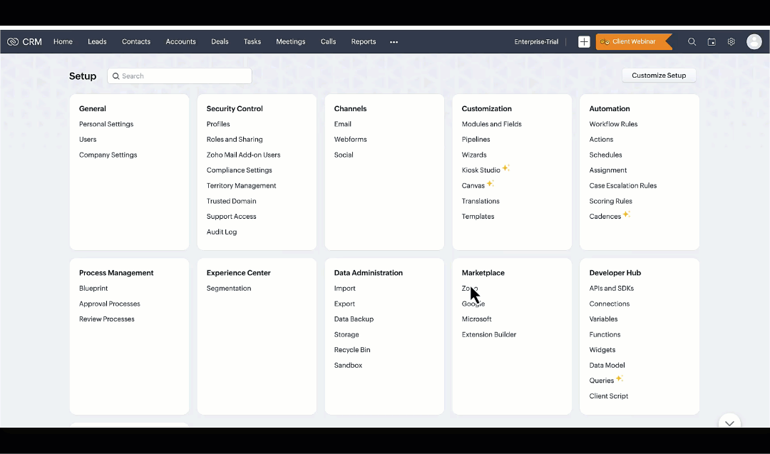 Pe lângă integrarea acestui instrument de webinare cu Zoho CRM, Zoho Webinars poate fi configurat și gestionat și în Sandbox-urile CRM. Sandbox-urile oferă o modalitate sigură de a replica conturile de producție, permițând testarea fără riscuri, instruirea și rafinarea proceselor înainte de a face modificări reale.