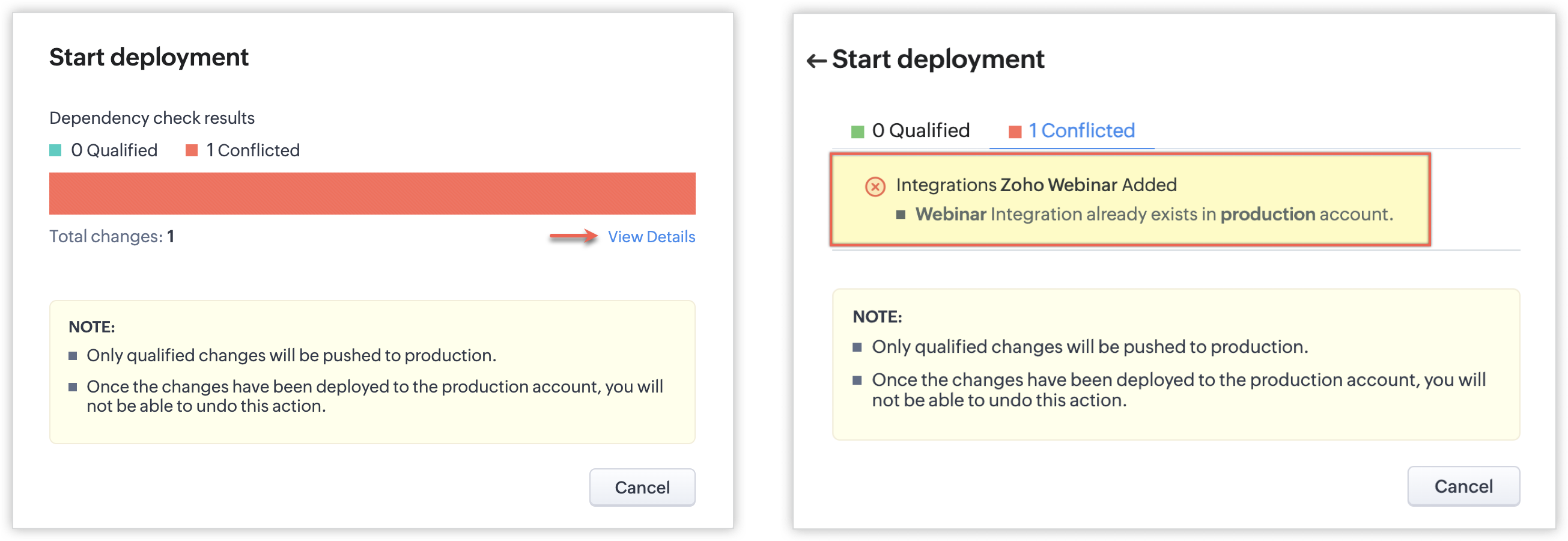 - Folosești câmpuri ale integrării webinar în alte locuri din sandbox. De exemplu, dacă ai configurat o regulă de workflow sau un blueprint folosind câmpuri create de integrarea webinar și nu incluzi această configurare în implementare, va apărea un conflict. Acest lucru se întâmplă deoarece integrarea webinar și câmpurile asociate sunt eliminate din sandbox odată ce integrarea este implementată. Cu toate acestea, configurarea dependentă rămâne și nu poate funcționa fără acele câmpuri, rezultând un conflict de implementare.