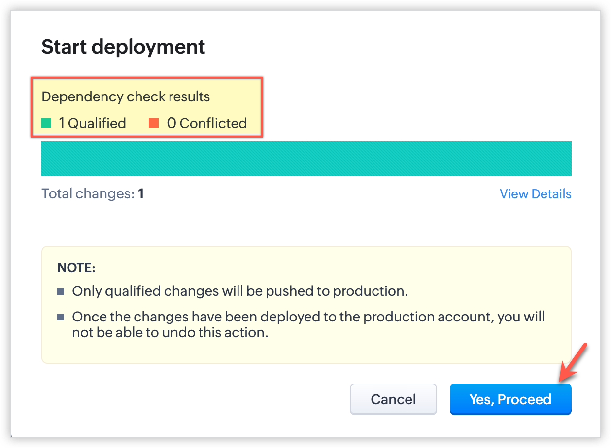 - În fereastra pop-up Start Deployment, verifică conflictele sub Dependency check results. Dacă nu există conflicte, apasă Yes, Proceed.