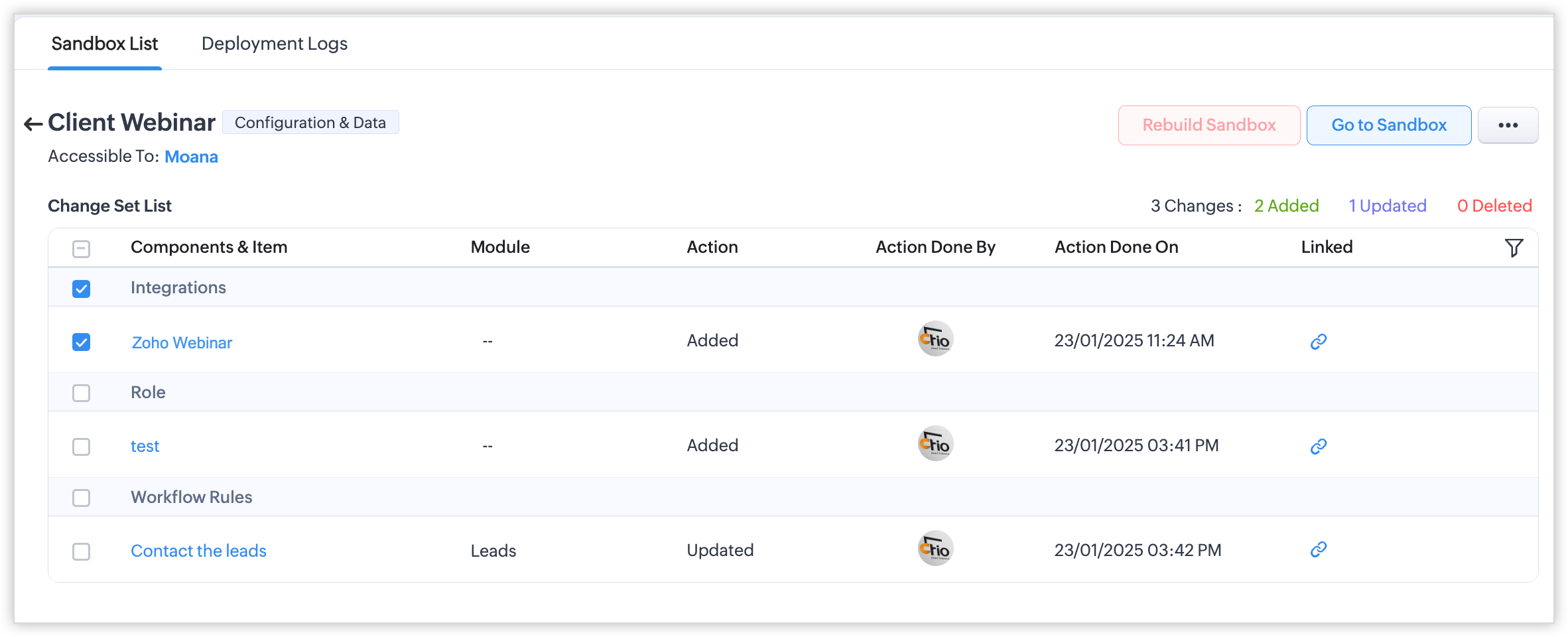 - O integrare Zoho Webinar existentă în contul de producție nu va fi copiată în sandbox în timpul creării sau reconstruirii sandbox-ului. Folosește sandbox-ul pentru a testa o integrare Zoho Webinar nouă.