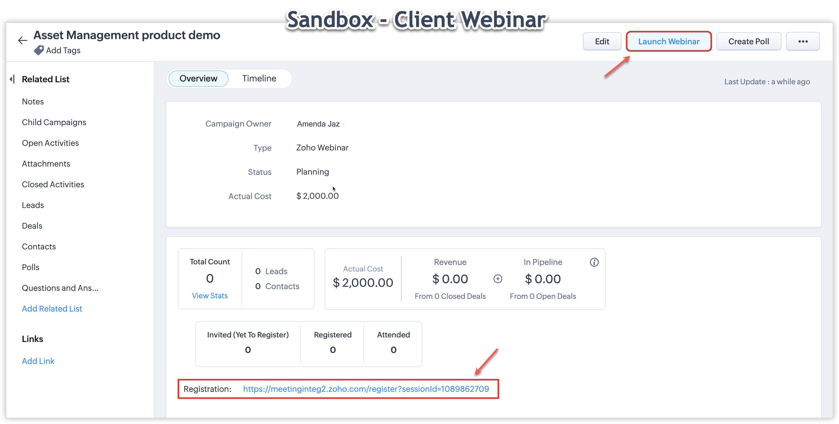 După realizarea integrării și configurarea contului Zoho Webinar în Sandbox-ul tău, creează un Zoho Webinar în Campaigns din Sandbox, după care va fi generat un URL de înregistrare. Îl poți folosi pentru testare și instruire cu privire la modul în care funcționează configurările realizate, cum să inviți potențiali participanți, să generezi rapoarte, să creezi sondaje etc.