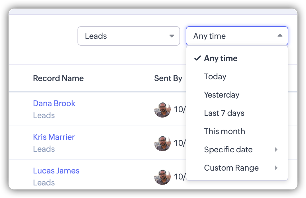 - Filtru dată – Any time, Today, Yesterday, This Week, Last Week sau Custom Range.