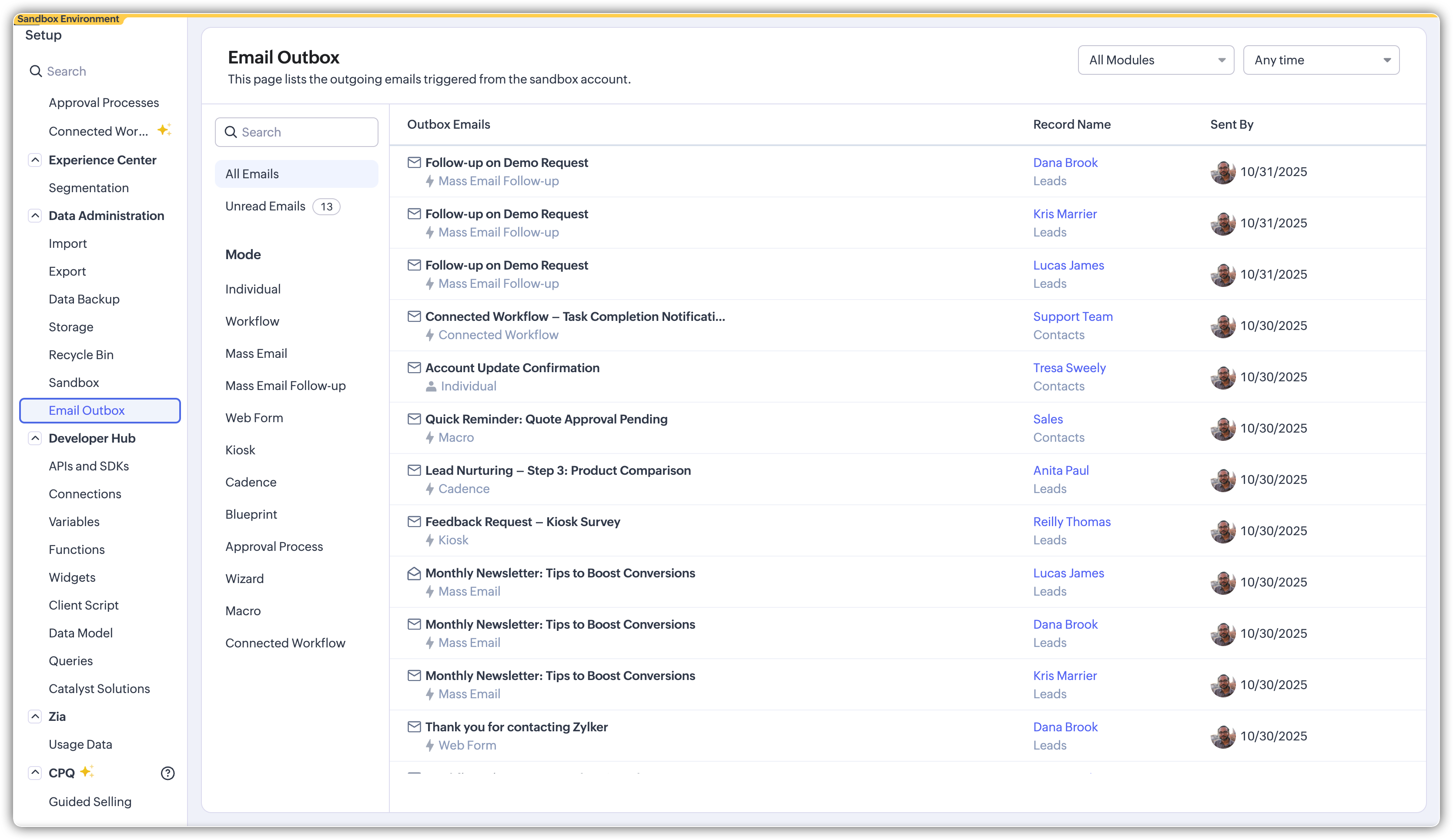 Testarea implică adesea verificarea faptului că automatizările, șabloanele și aprobările generează emailurile corecte. Email Outbox păstrează fiecare mesaj generat de sandbox într-un singur loc, astfel încât problemele pot fi rezolvate înainte de implementare.