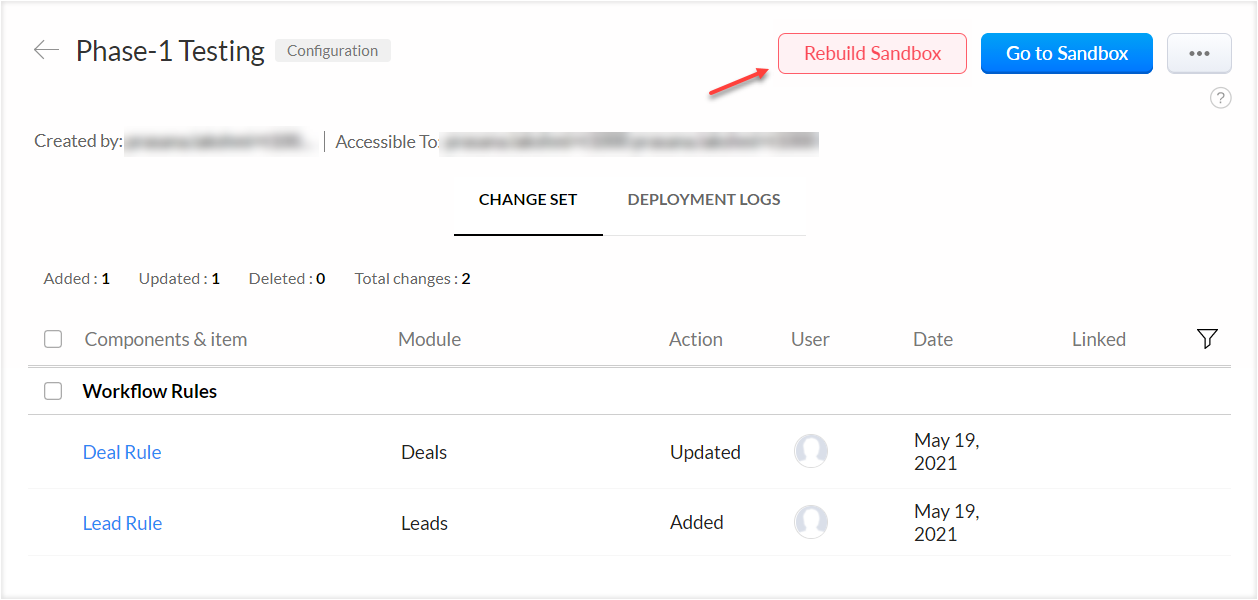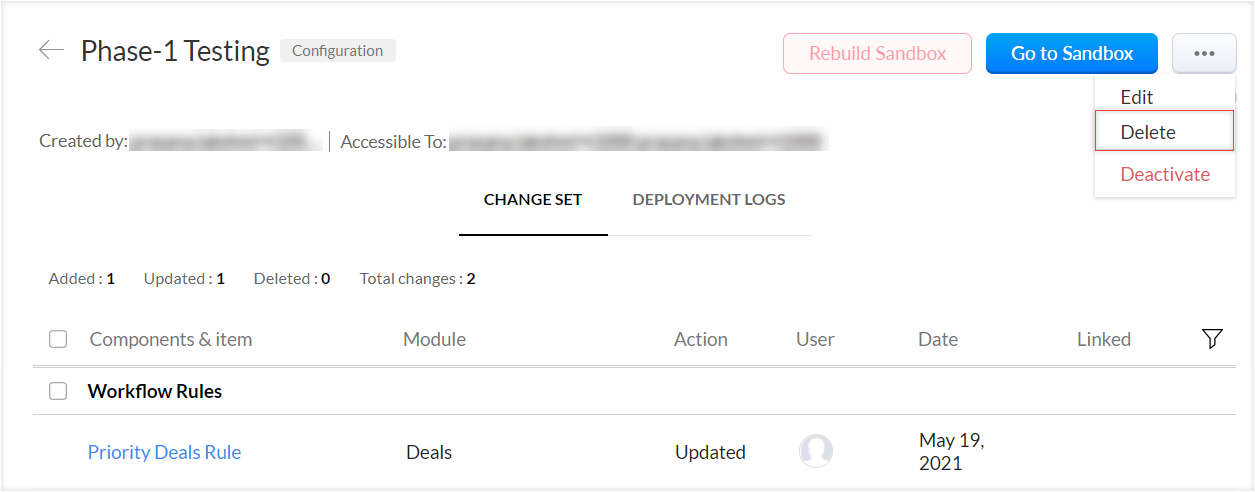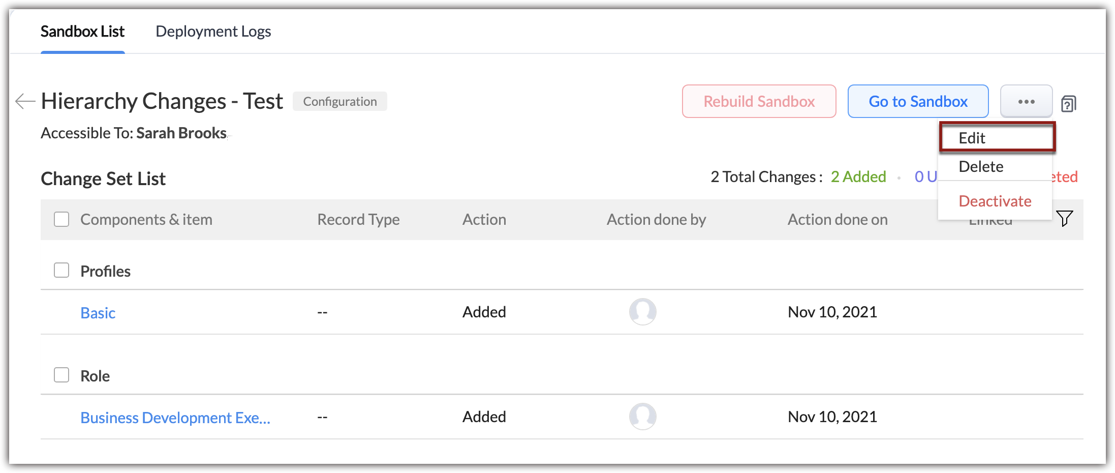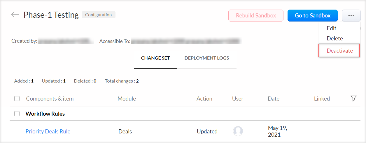 - După reactivarea sandbox-ului, toate modificările neimplementate listate în Setul de modificări înainte de dezactivare vor fi păstrate și pot fi implementate în producție.