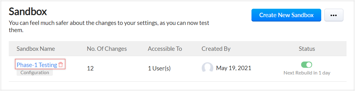 Alternativ, îl poți șterge din pagina Sandbox, apăsând pe pictograma de ștergere de lângă numele sandbox-ului.