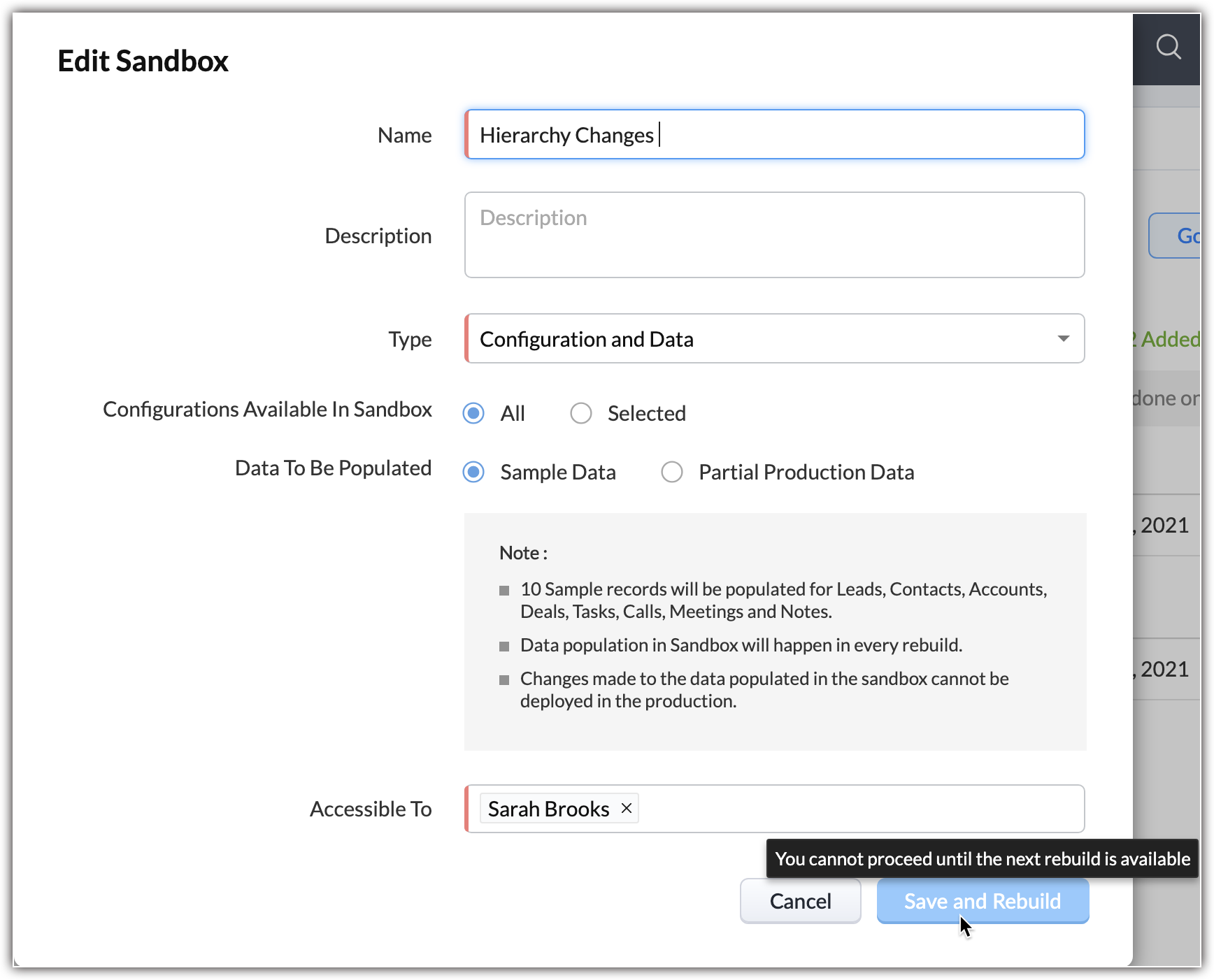 Reține că câmpurile, tipul sandbox-ului și datele care vor fi populate pot fi modificate și salvate doar dacă opțiunea Rebuild Sandbox este disponibilă.