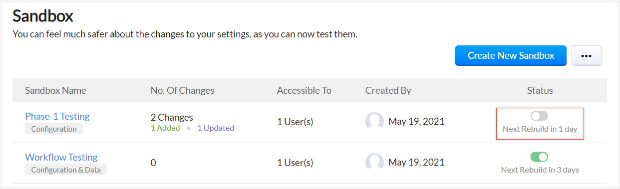Alternativ, poți comuta Statusul din pagina cu lista Sandbox.