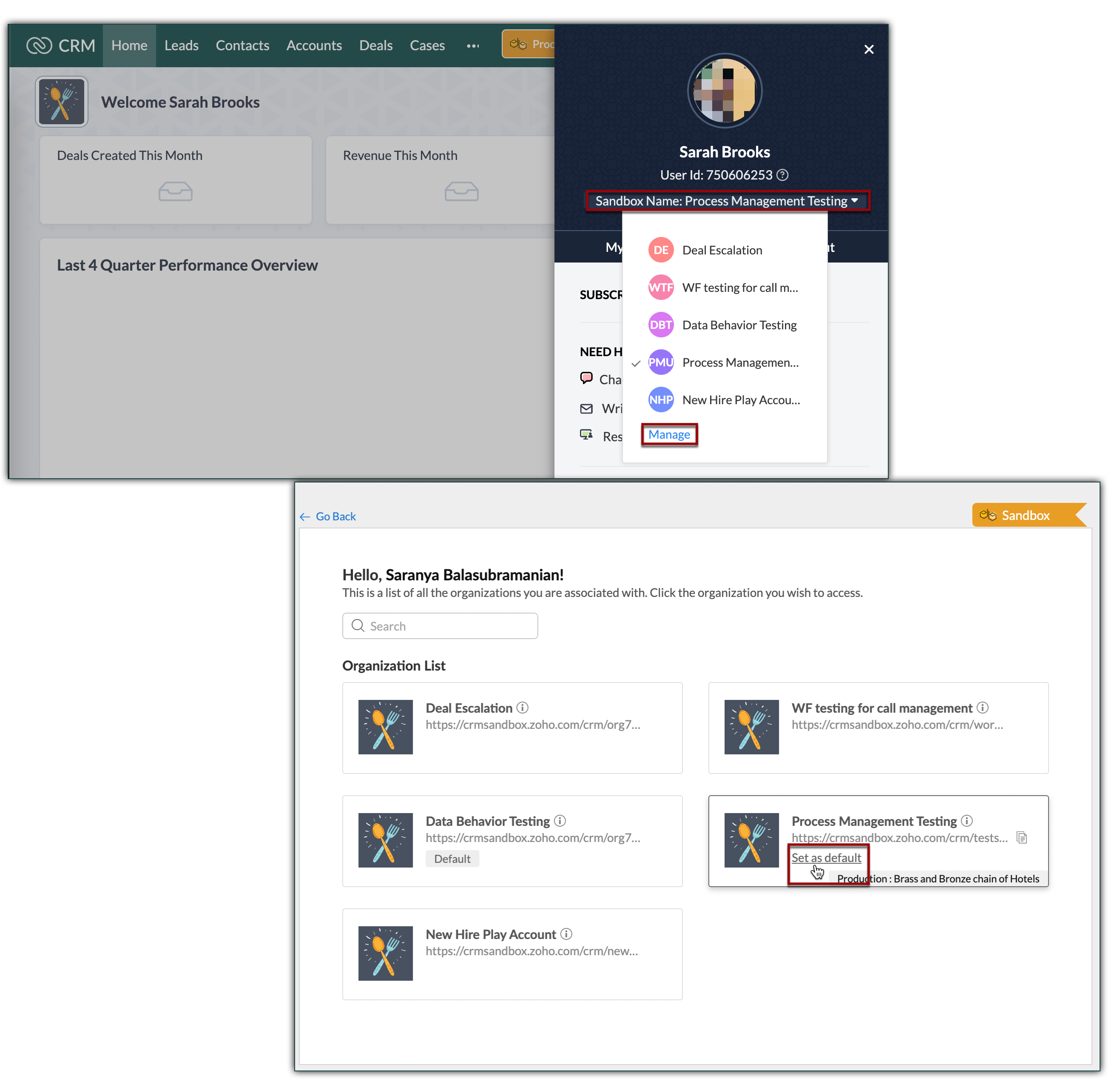 Utilizatorii și Dezvoltatorii care au acces la mai mult de un cont sandbox pot seta un cont implicit pentru ei. Aceasta ajută, de asemenea, utilizatorii să comute ușor între diferite conturi sandbox.