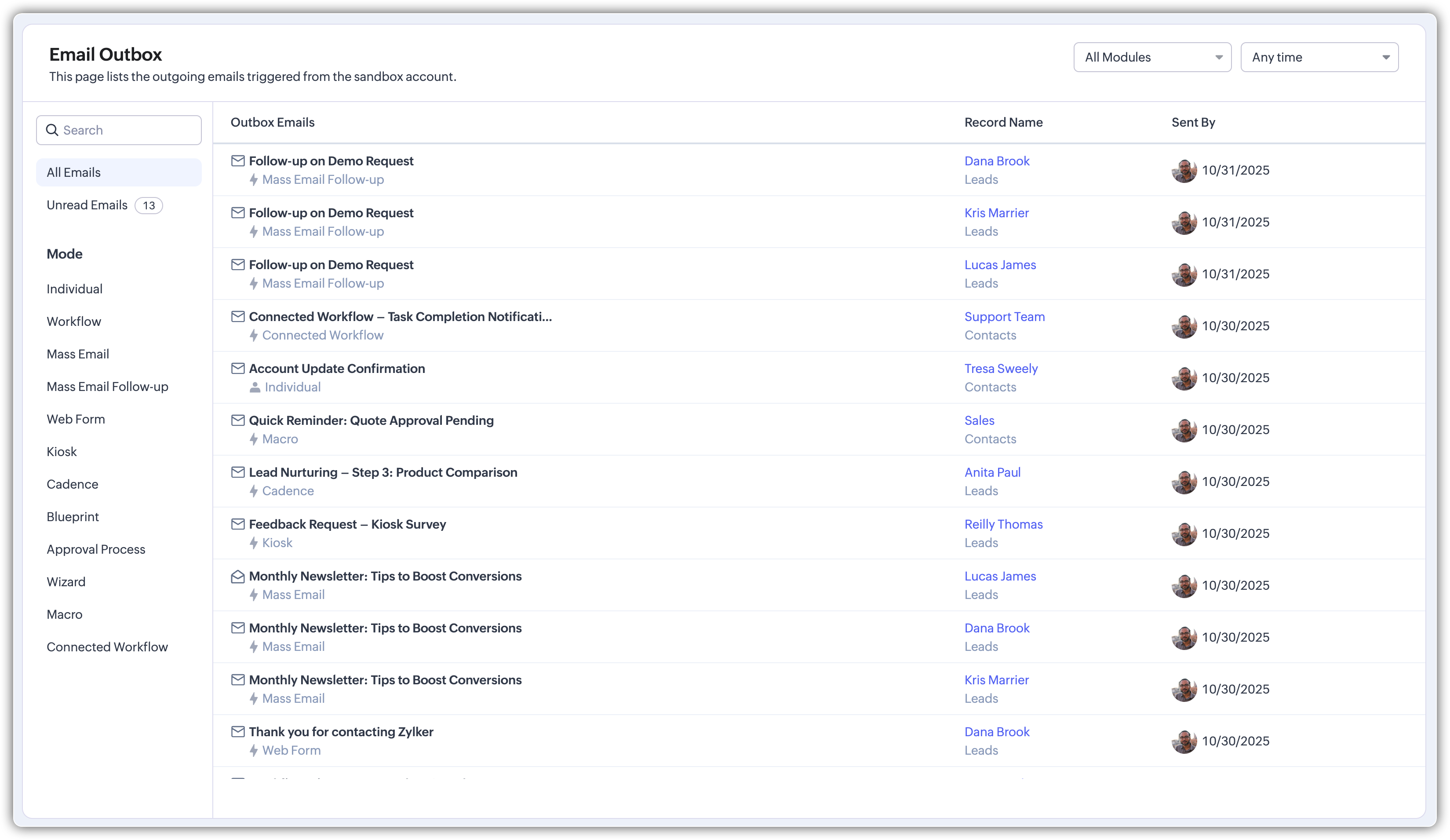 Outbox oferă fiecărui sandbox propria tavă pentru testarea și vizualizarea emailurilor trimise. Poți naviga la pagina Setup, iar opțiunea Email Outbox va fi listată sub Data Administration. Tabelul include emailuri individuale, alerte de workflow și emailuri în masă. Revizuirea acestei liste ajută la confirmarea câmpurilor de îmbinare, condițiilor de declanșare și formatării înainte ca modificările să fie mutate în contul de producție.