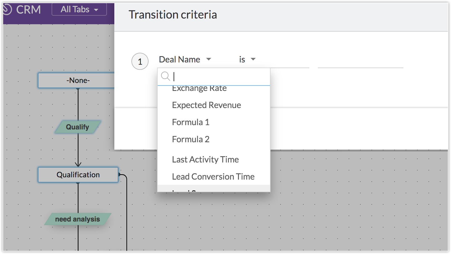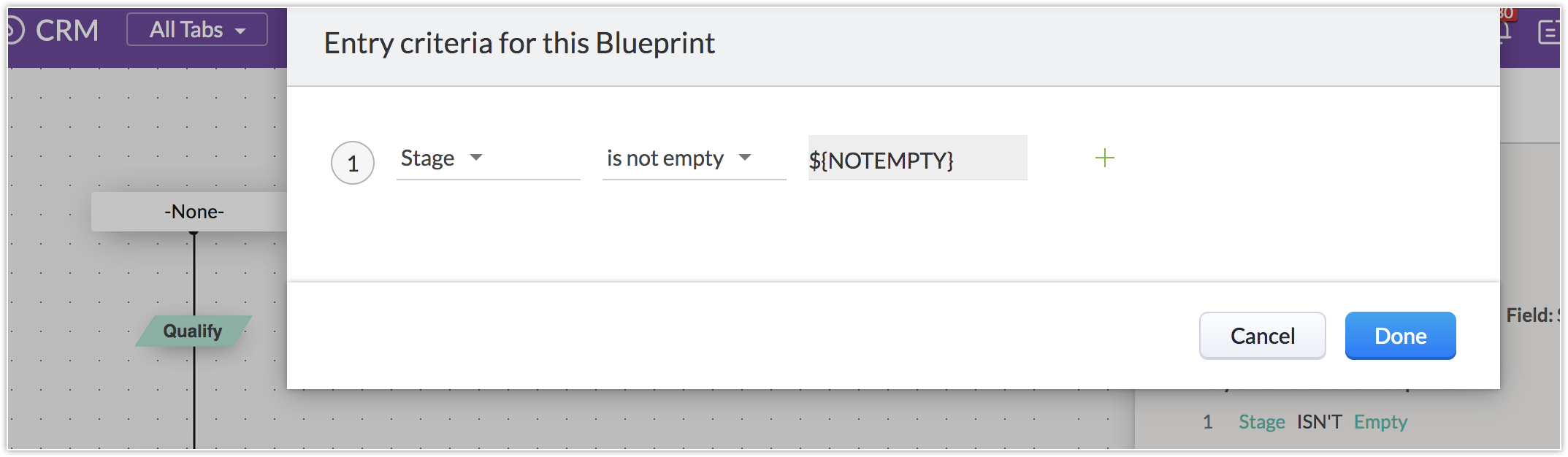 Starea „None" apare pentru toate listele de tip picklist din modulul Deals, cu excepția Stage. Dacă nu vrei să declanșezi Blueprint-ul când stage-ul este „None", setează criteriul de intrare ca „Picklist nu este gol" sau elimină starea None.