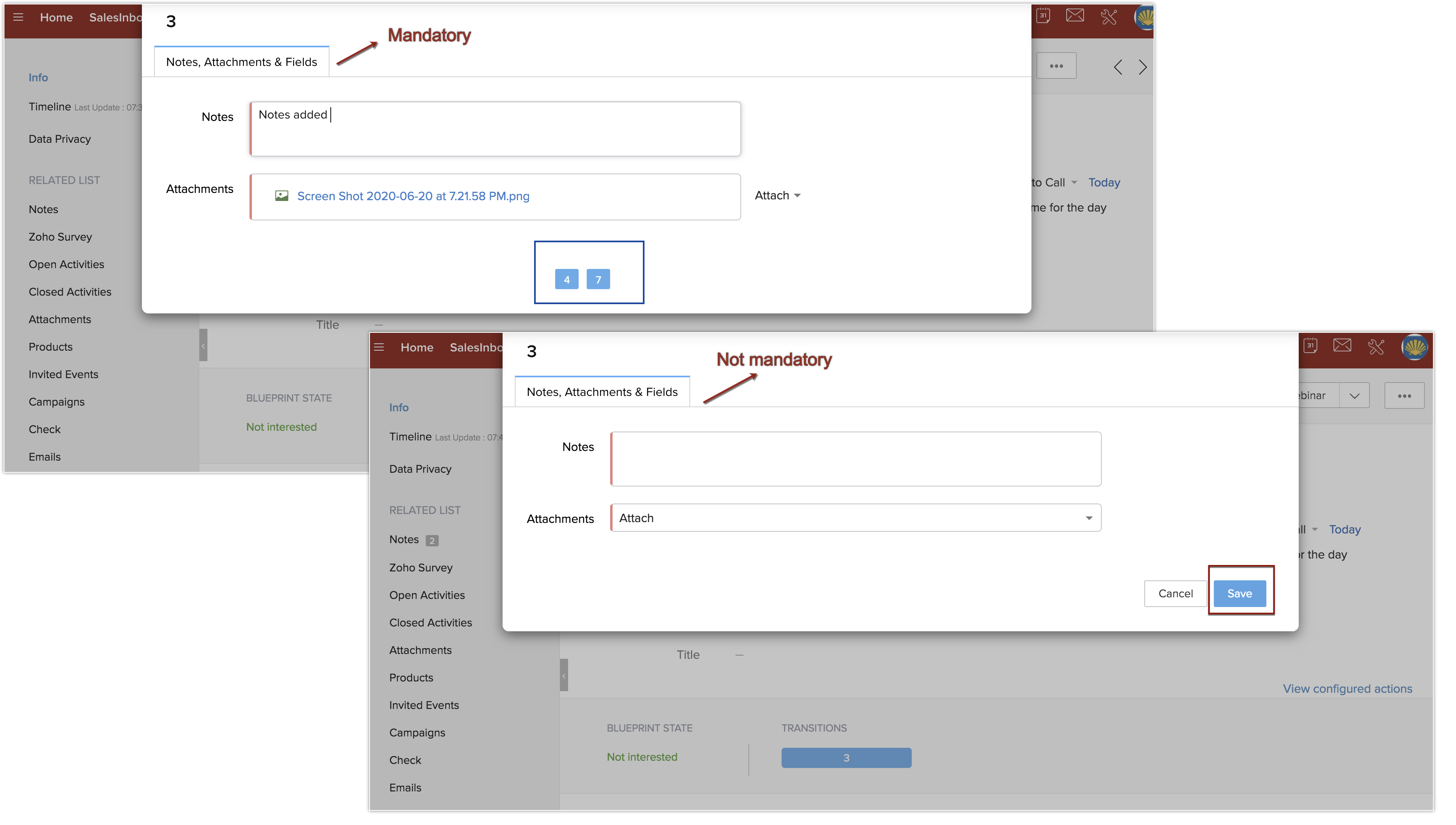 Dacă un Blueprint este setat ca continuu și ai setat notele și atașamentul ca obligatorii, în timpul procesului, Blueprint-ul va afișa următoarea tranziție disponibilă în loc de butonul Salvare.