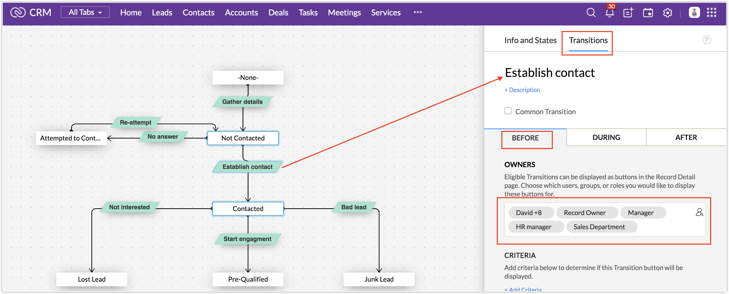 Dacă o anumită tranziție, vizibilă pentru administratori, nu este vizibilă și pentru utilizatorii cu un profil personalizat, un anumit rol sau care fac parte dintr-un departament specific, asigură-te că utilizatorul a fost adăugat în secțiunea Înainte a tranziției. Astfel, tranziția va fi disponibilă pe pagina de detalii a înregistrării.