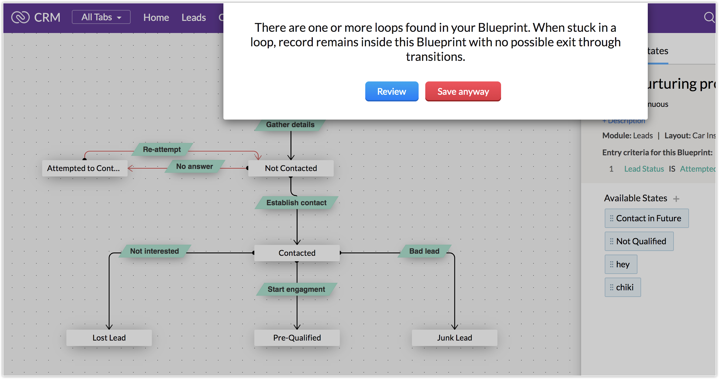 Această alertă indică faptul că o înregistrare se va bloca într-un ciclu de buclă, trecând prin aceleași tranziții din nou și din nou, fără nicio modalitate de a ieși din buclă pentru a finaliza procesul Blueprint. Apasă pe butonul Revizuire pentru a vizualiza și rezolva bucla.