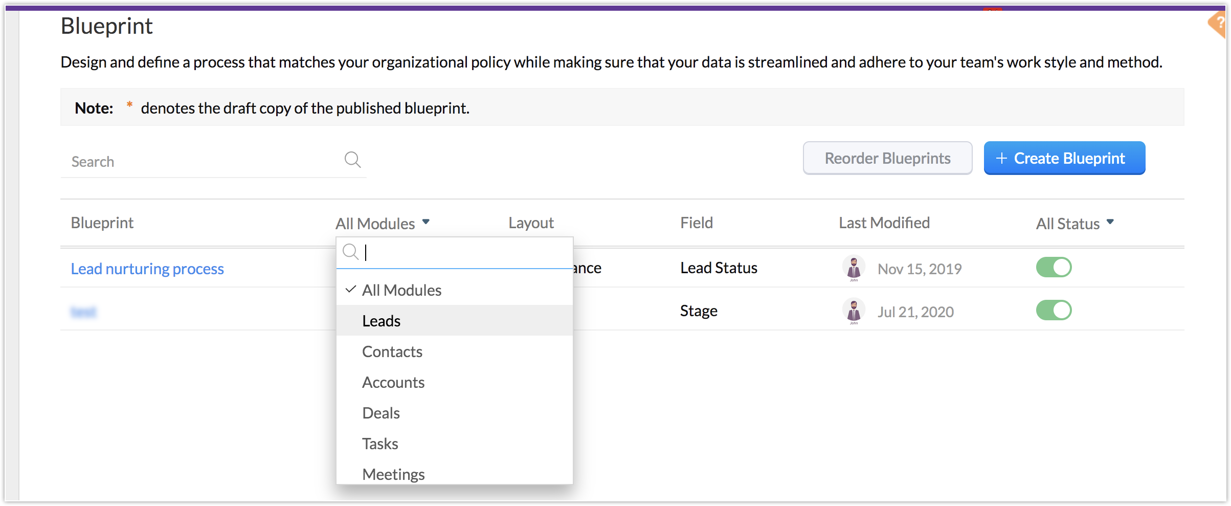 Verifică dacă Toate modulele este selectat în Configurare > Automatizare procese > Blueprint. Doar atunci Blueprint-urile create pentru toate modulele vor fi afișate în lista de vizualizare.