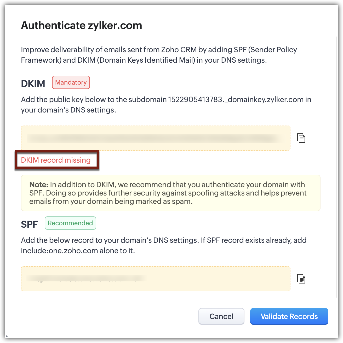 Dacă SPF este populat, dar tot primești eroarea „SPF record missing", așteaptă 24 de ore și apoi selectează Validate record in the CRM. Dacă problema persistă după 24 de ore, contactează echipa noastră de suport (support@zohocrm.com).