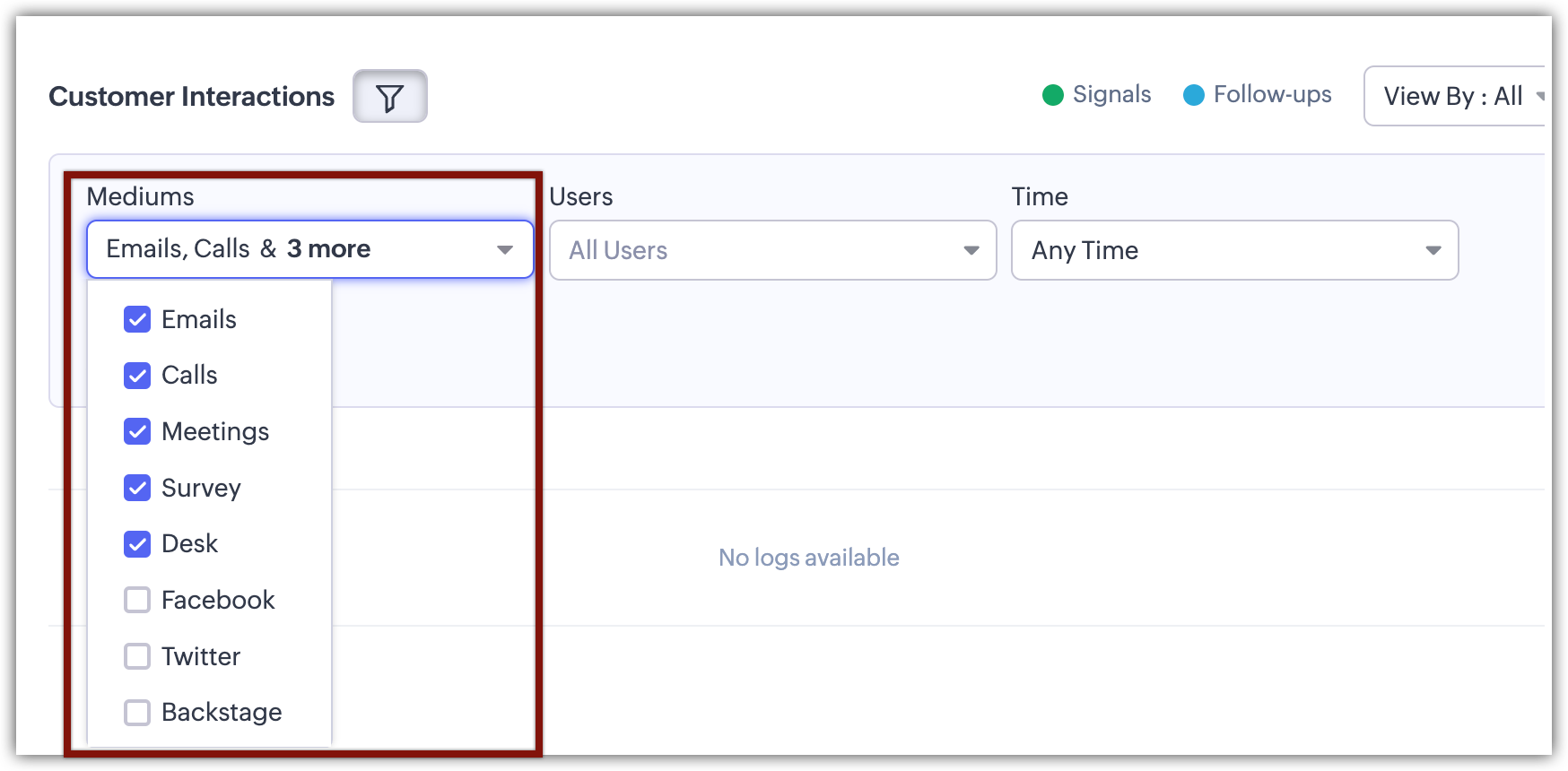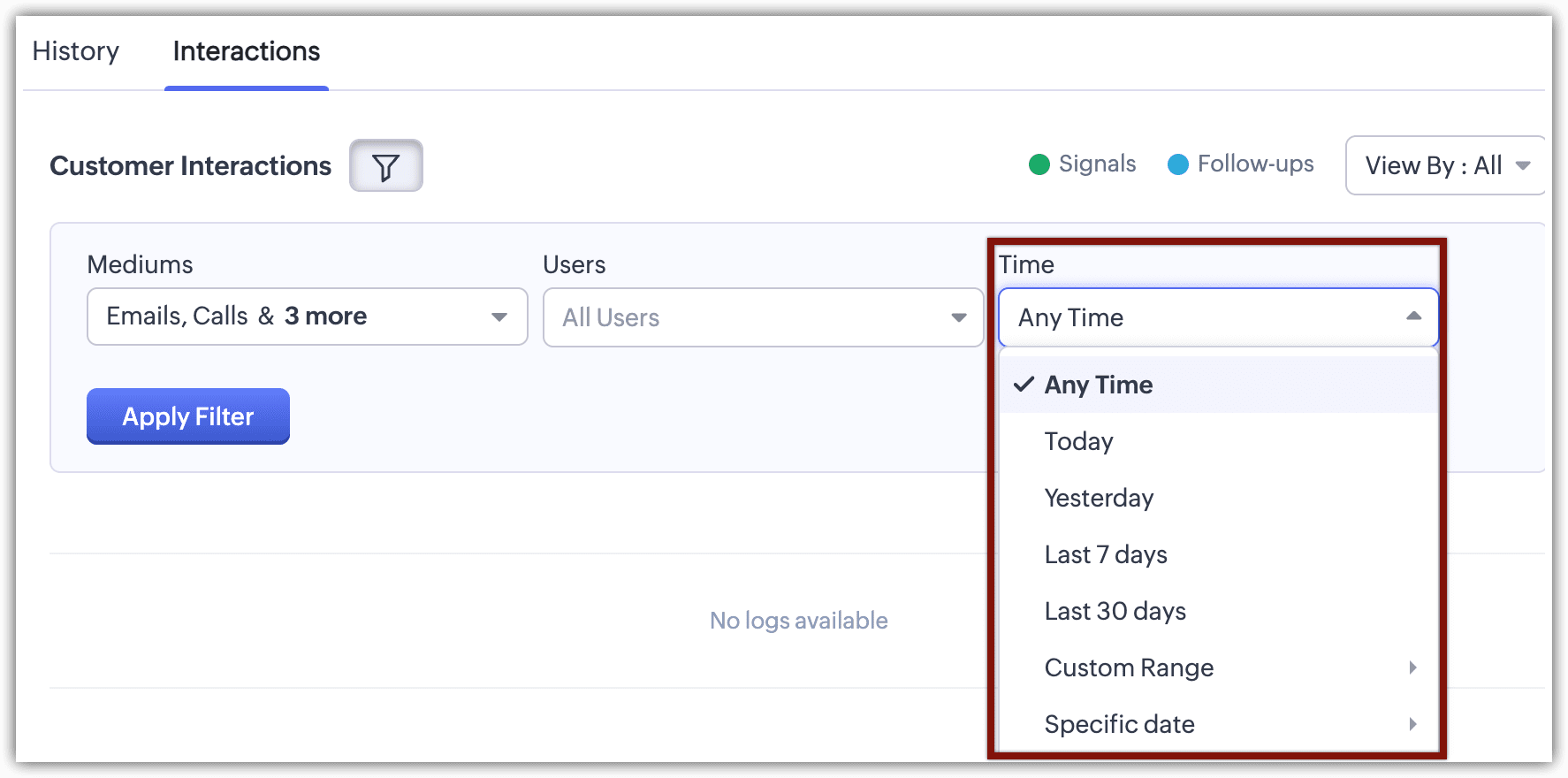 Filtrele sunt instrumente care restrâng rezultatele căutării legate de diverse tipuri de interacțiuni cu clienții, simplificând procesul de localizare a anumitor puncte de contact.