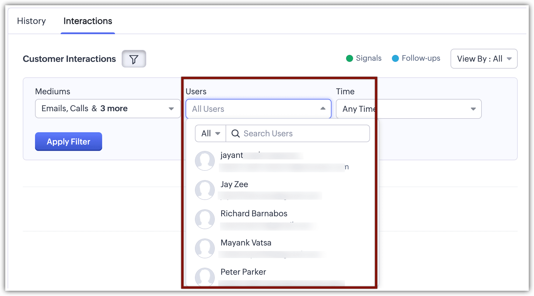Utilizatori: În fila Interacțiuni, poți alege unul sau mai mulți utilizatori pentru a restrânge căutarea la interacțiunile cu clienții asociate specific acelor utilizatori.
