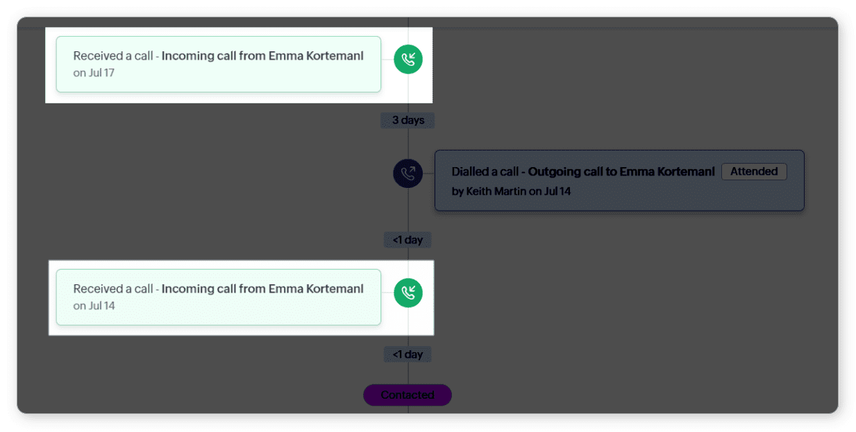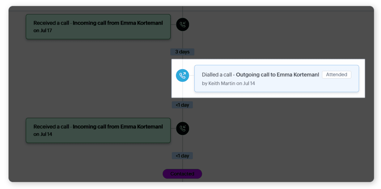 Urmăriri: Acestea sunt acțiuni întreprinse de utilizatorii CRM din organizația ta pentru a interacționa cu clientul. Detaliile includ utilizatorul CRM care a inițiat sau a răspuns la acțiune și data specifică a urmăririi. Pentru a vedea ora exactă la care a avut loc o urmărire, pur și simplu plasează cursorul peste data acesteia. Aceste urmăriri sunt organizate în partea dreaptă a traseului.