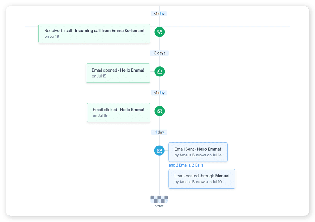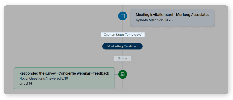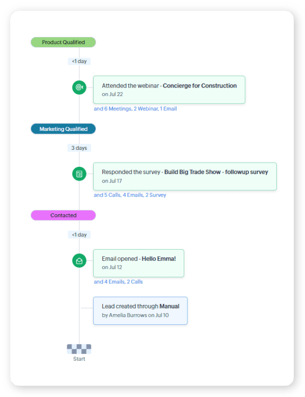 - Obține o imagine completă a parcursului unui client, începând din momentul în care acesta intră în CRM ca lead sau contact.