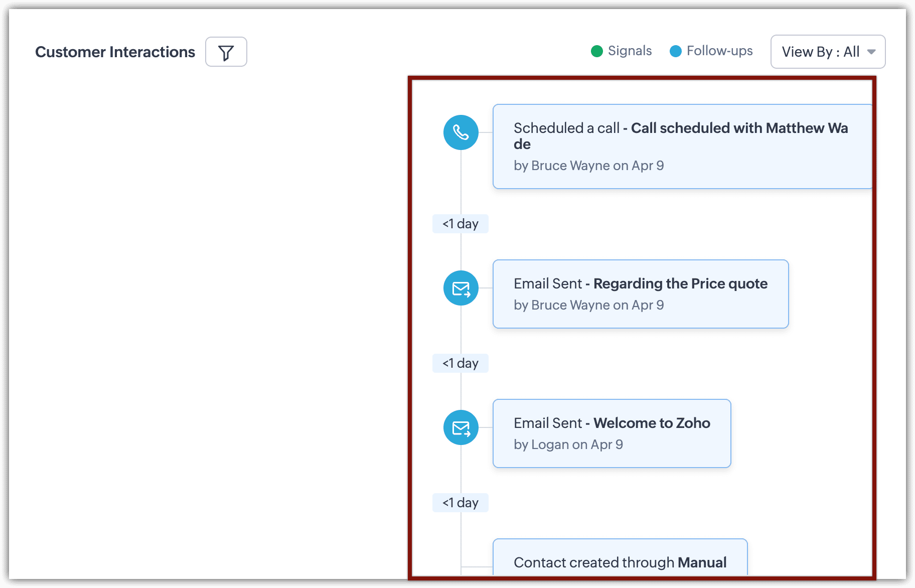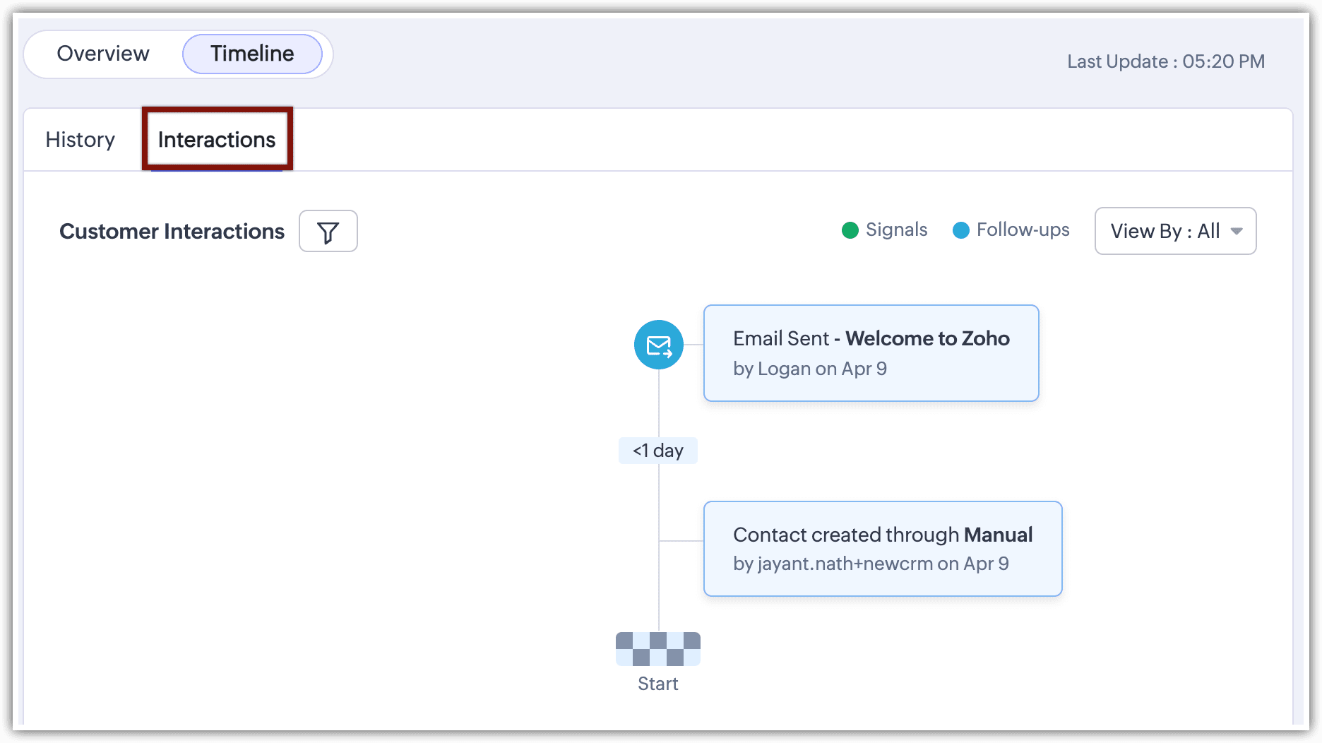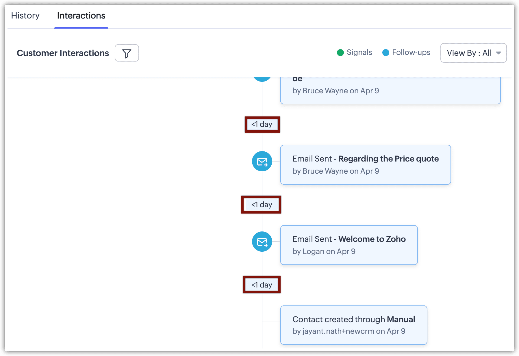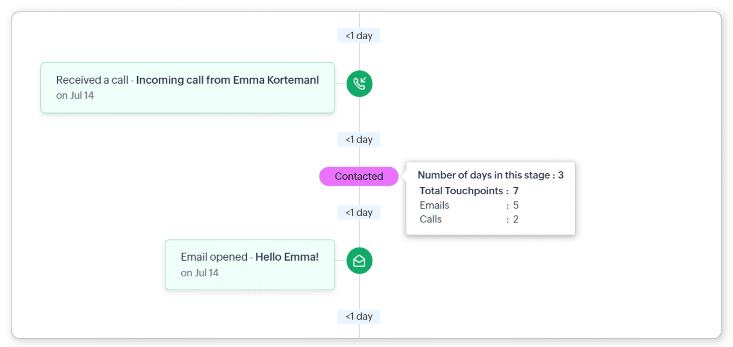 Zoho CRM simplifică acest lucru cu fila Interacțiuni pentru fiecare lead sau contact. Această filă prezintă o secvență detaliată a fiecărei ocazii în care un client a luat legătura cu afacerea ta, acoperind diverse metode de comunicare, în ordinea exactă în care s-au produs. Această vizualizare organizată asigură că echipele pot oferi servicii personalizate cu acuratețe, răspunzând nevoilor și istoricului specific al fiecărui client.