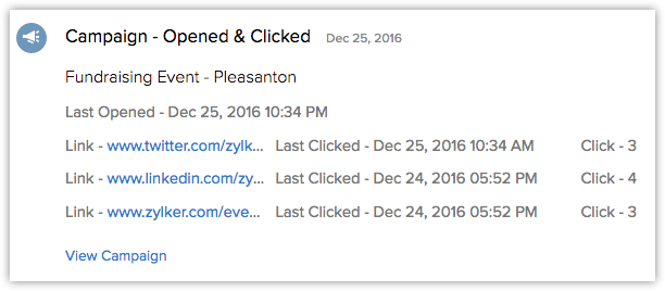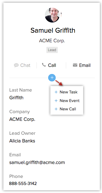 Împreună cu toate notificările, fiecare semnal oferă detaliile contactului, cum ar fi numele, compania, adresa de email, numărul de telefon etc. Aici ai opțiunea de a iniția instantaneu o conversație, de a efectua un apel sau de a trimite un email contactului. În plus, poți crea sarcini, evenimente și apeluri.