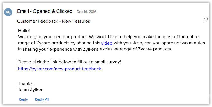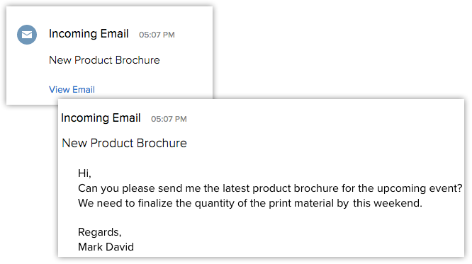 Pentru emailurile necitite, vei putea vizualiza conținutul emailului când dai clic pe semnalul de vânzări. În cazul emailurilor citite, va fi disponibil un link Vizualizare Email. Opțiunile Răspunde și Răspunde tuturor te ajută să răspunzi rapid la emailuri.