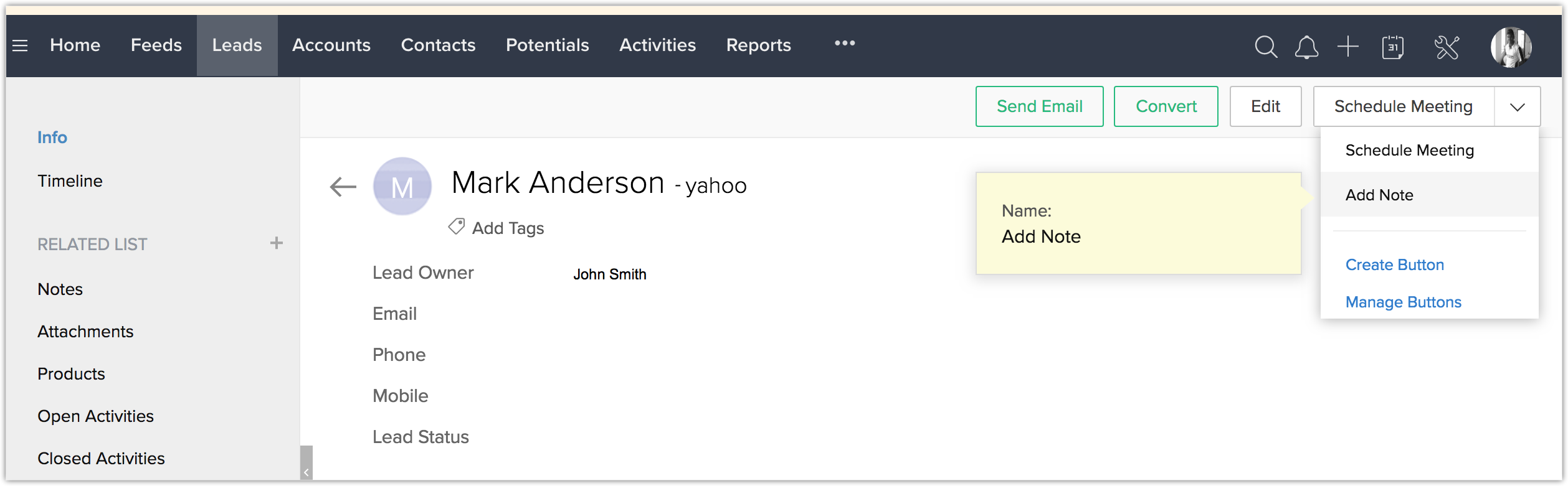 Odată ce extensia OneNote este instalată corect, butonul personalizat Add Note va fi adăugat în pagina de vizualizare a înregistrărilor Zoho CRM.