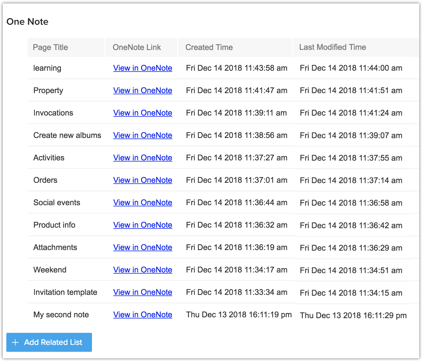 Toate notele adăugate la o înregistrare vor fi listate în lista asociată OneNote notes. În OneNote,
