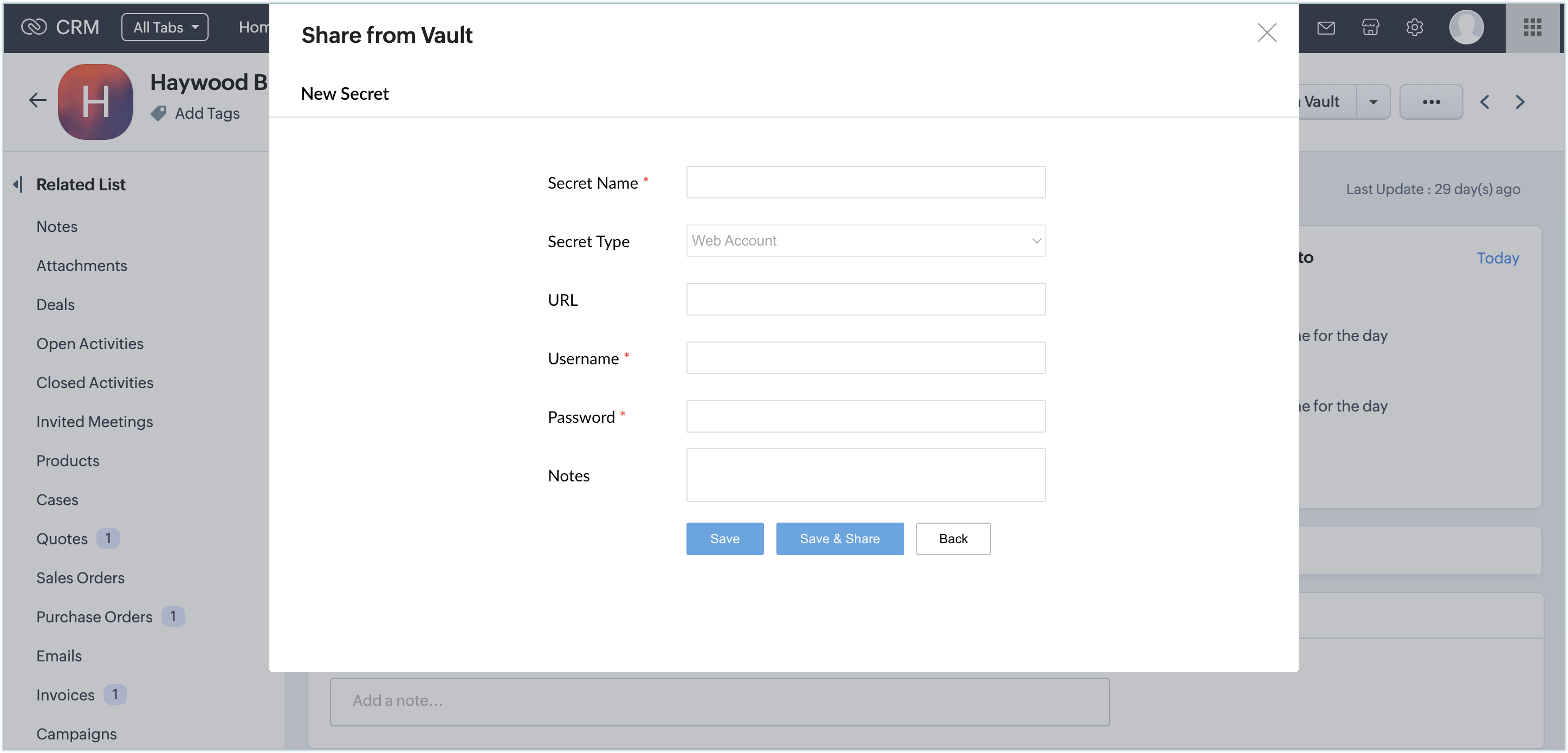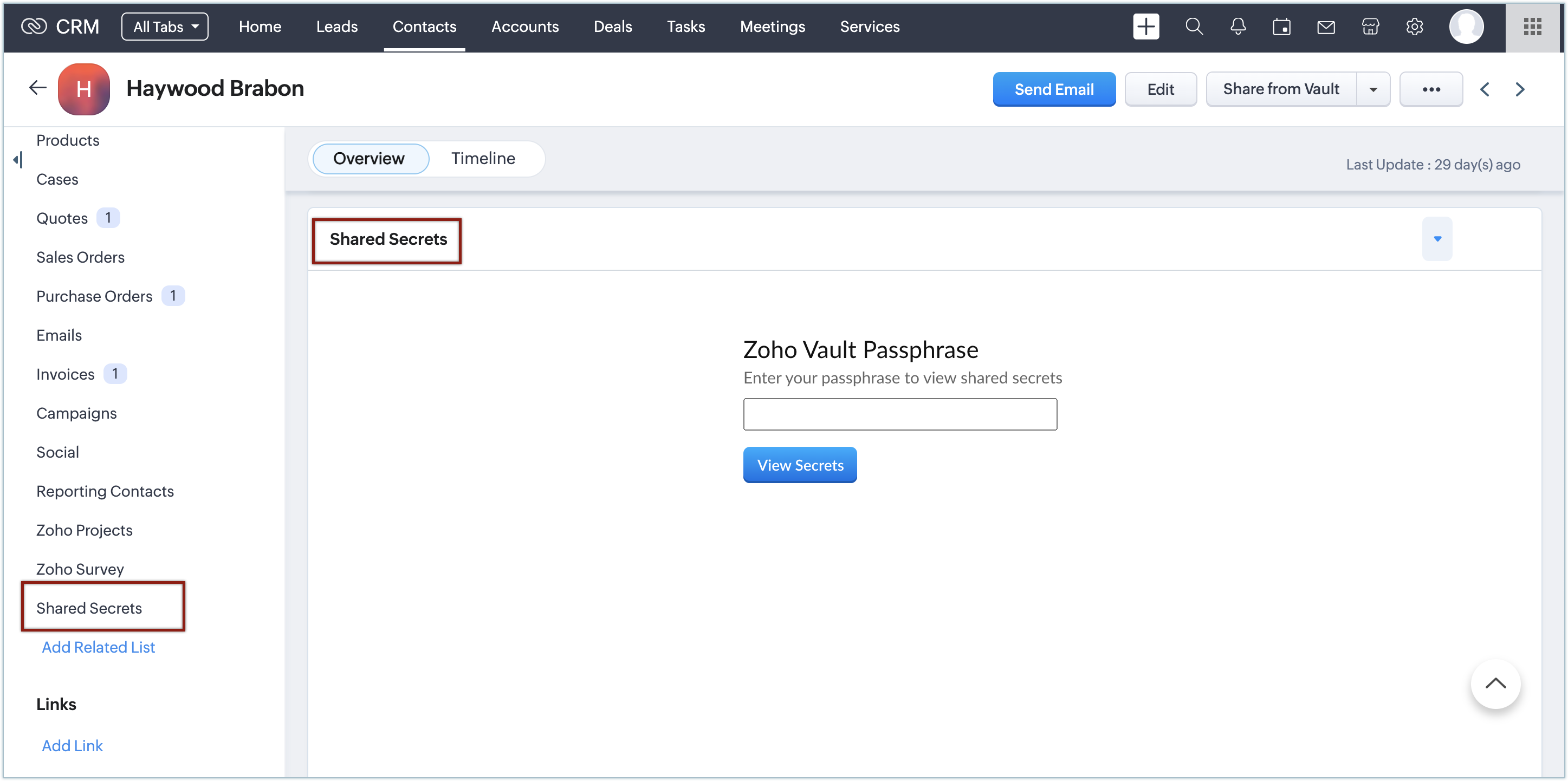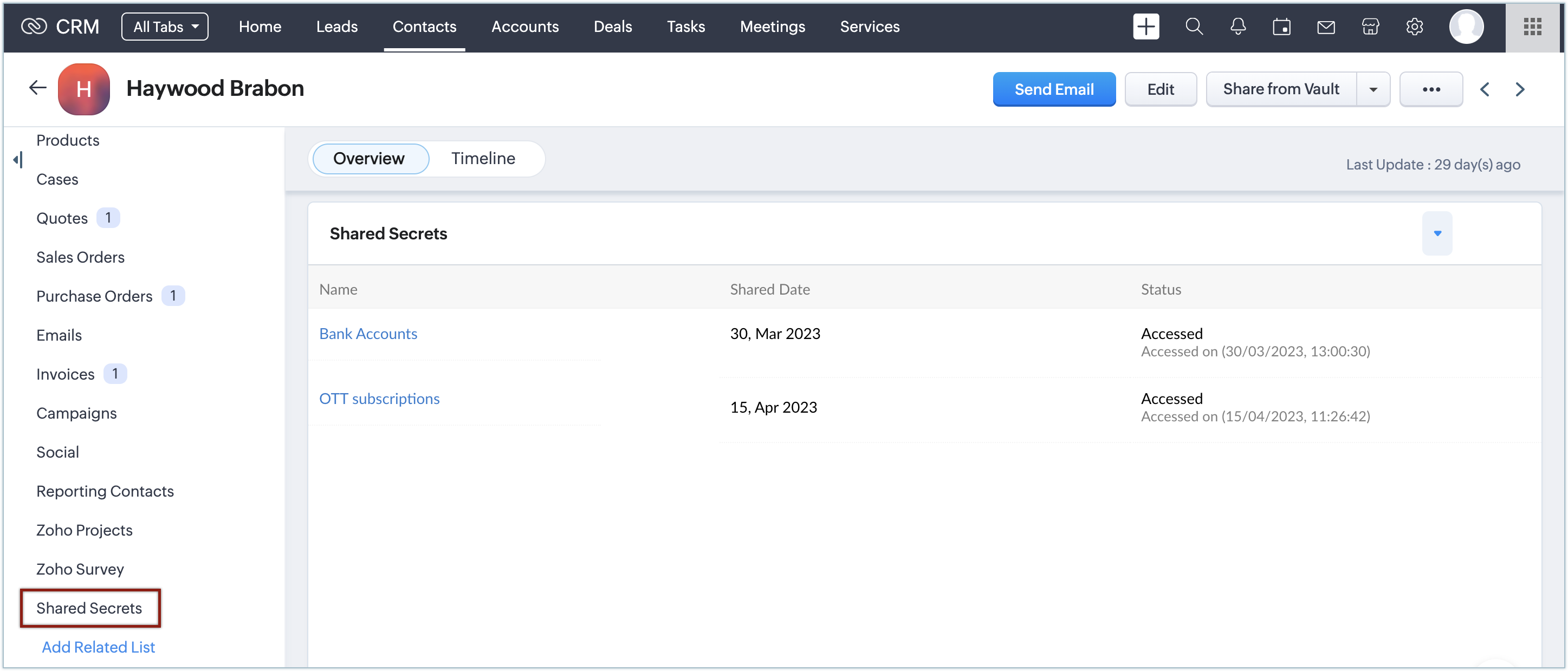 Toate secretele pe care le partajezi cu fiecare lead, contact și cont din Zoho CRM vor fi listate în lista asociată a acelei înregistrări.