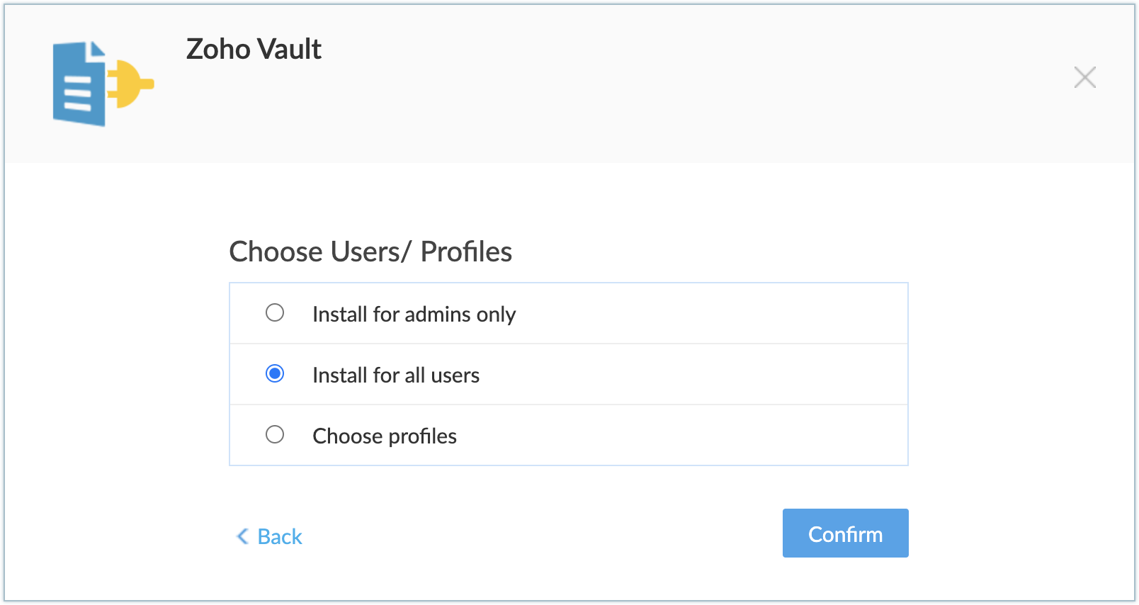 - Choose profiles - Extensia va fi instalată în CRM pentru utilizatorii selectați manual. Alege această opțiune, apasă Confirm, apoi selectează profilurile dorite.