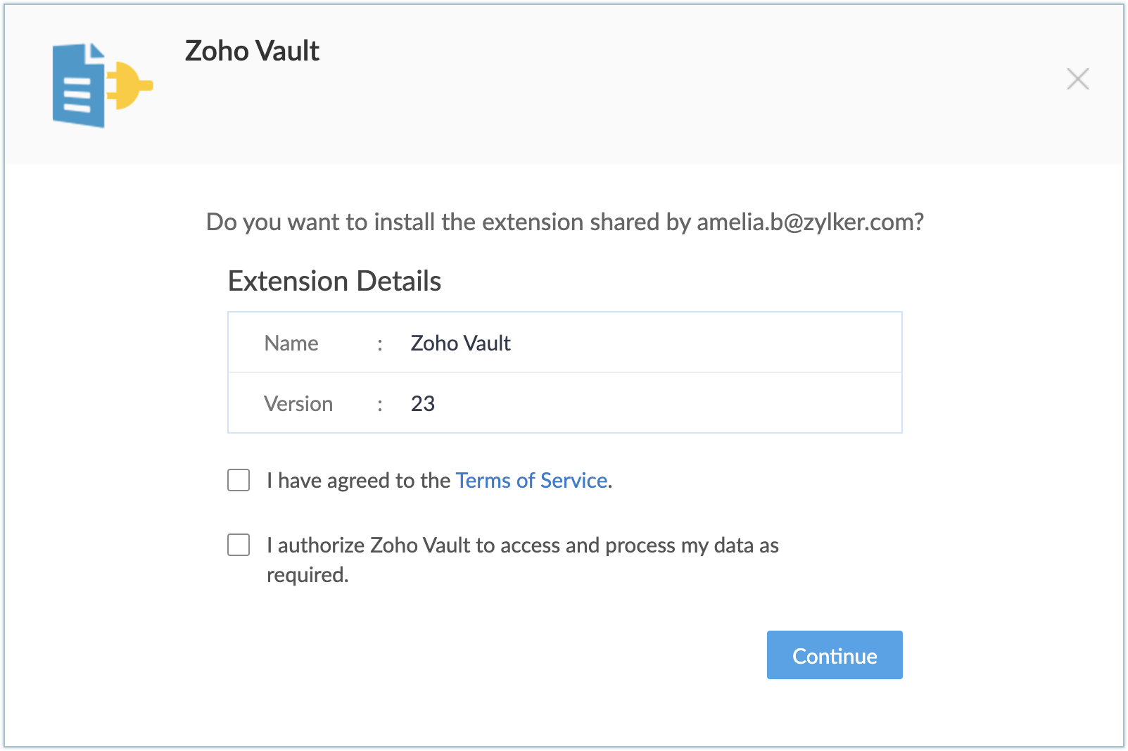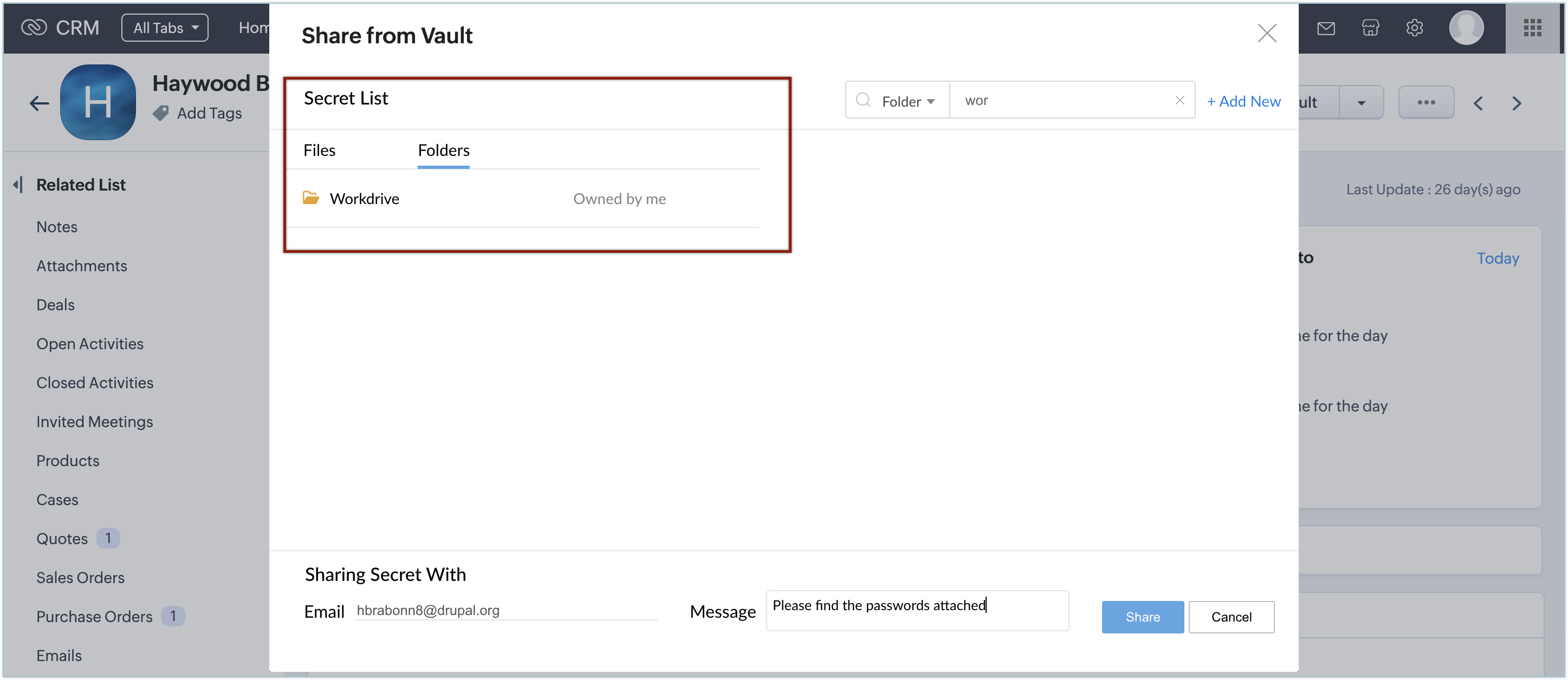 Poți folosi fraza de acces Zoho Vault pentru a partaja secretele tale cu înregistrările din modulele Leads și Contacts. Asigură-te că înregistrarea pe care o alegi are o adresă de email validă. În caz contrar, nu vei putea partaja secrete cu aceasta.