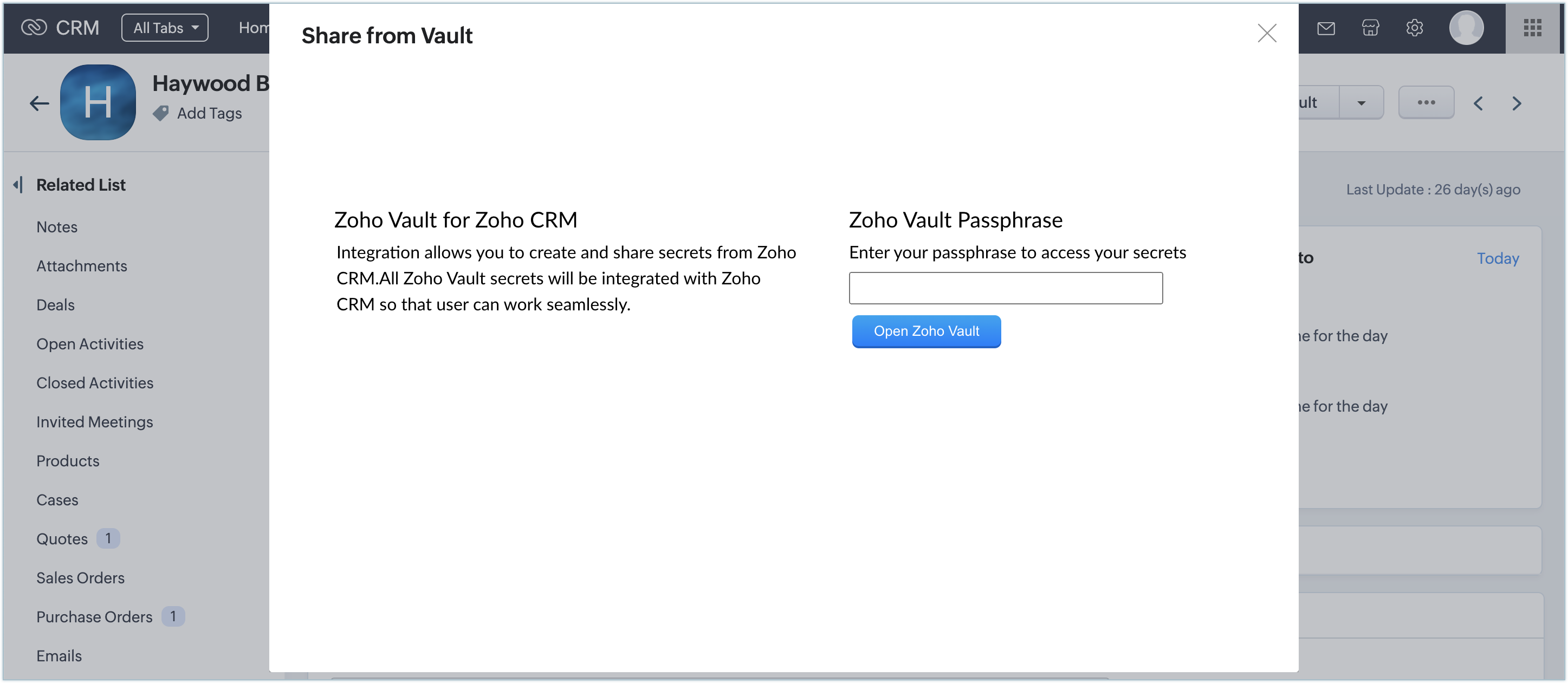 Extensia Zoho Vault pentru Zoho CRM îți permite să partajezi parole cu contactele tale și alte părți terțe, cu diferite niveluri de permisiuni de acces. Tot ce trebuie să faci este să introduci fraza de acces Zoho Vault pentru a accesa parolele și alte date confidențiale din Zoho CRM.